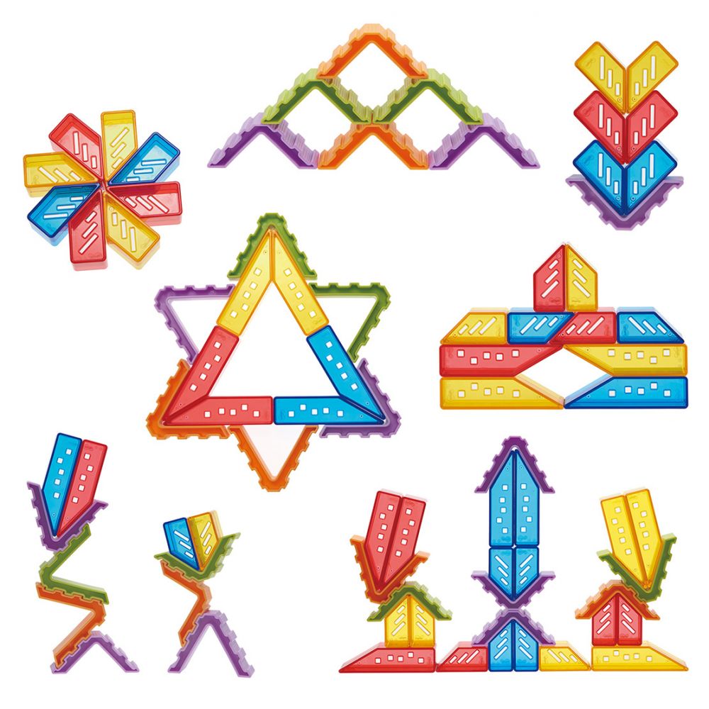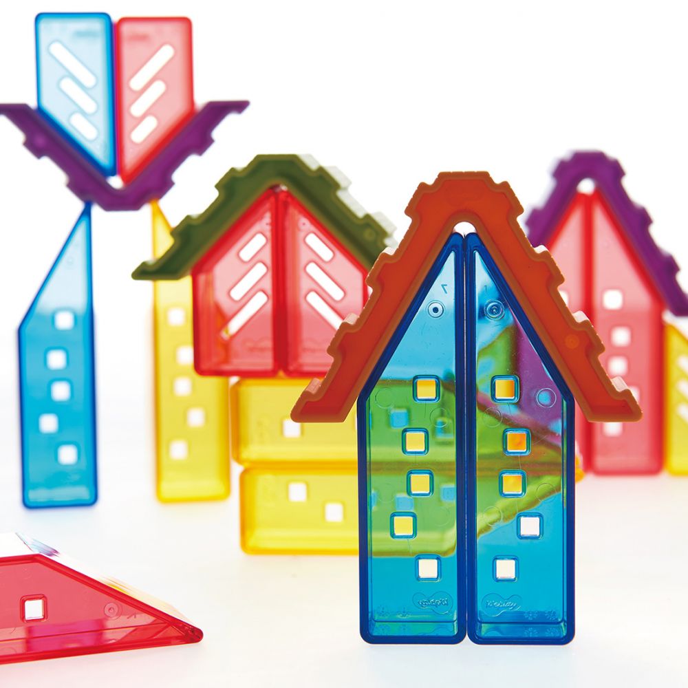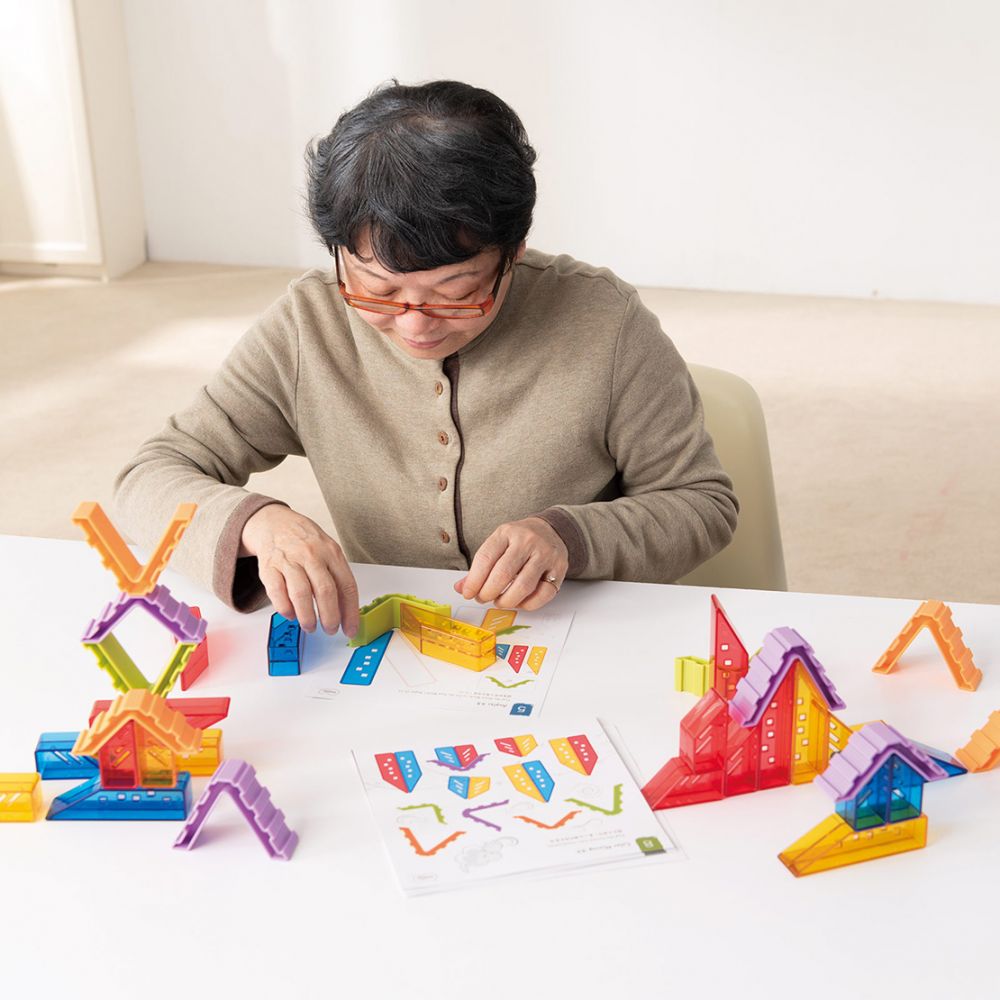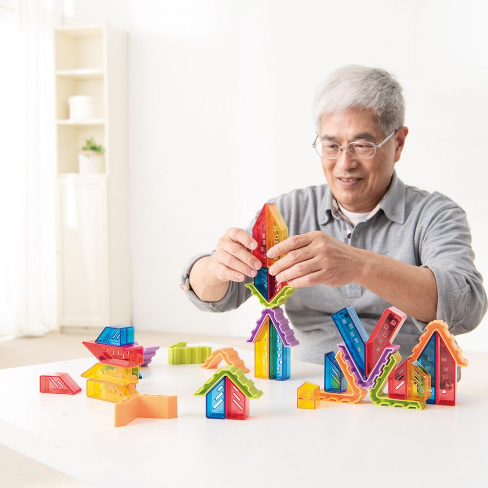 哇!亮晶晶、傾斜、倒立的房子…這是魔法屋吧!由6棟高房子,6棟矮房子,搭配兩種屋頂角度,不論各種瘋狂組合,都能建構出繽紛又獨特的魔法屋!還能觀察透明與混色的光影變化,或依圖卡進行角度、序列等數學遊戲,多元的功能,百玩不膩!