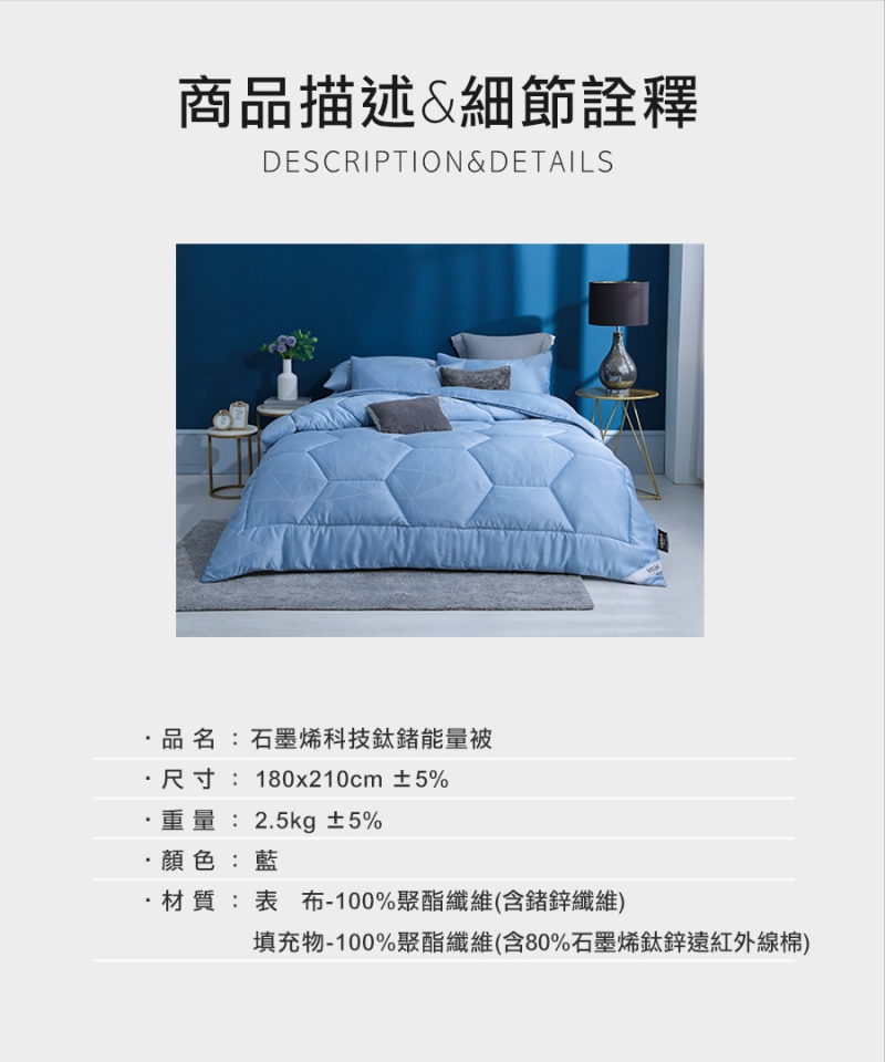 • Filling - 100% Polyester (including 80% graphene-titanium-zinc far-infrared cotton)