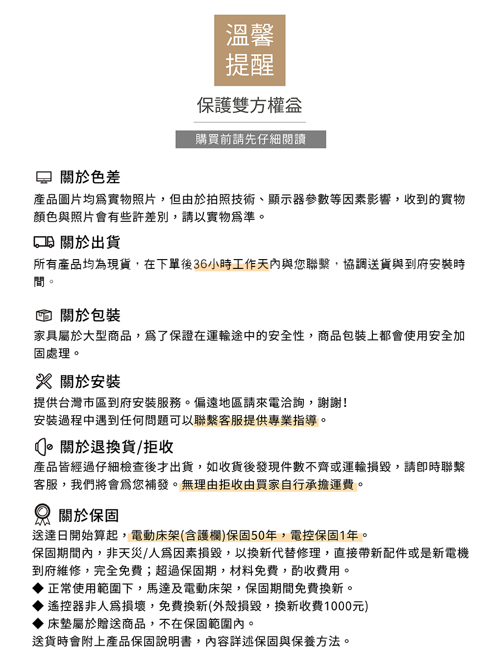 12. Warranty:Electric Bed Frame (including guardrails) - 50 years (must keep warranty card and purchase receipt)