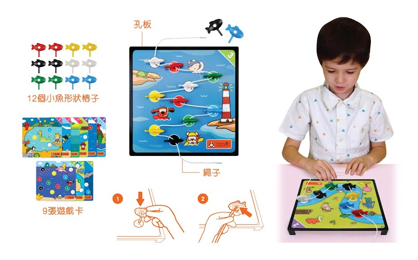 EZ66 recommends the【K's Kids】Little Fish Threading Fun. This game includes a pegboard, 12 colorful fish-shaped pegs, 9 game cards, and 2 strings.