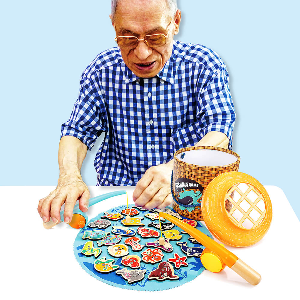EZ66 recommends the【Top Bright】Happy Ocean Fishing Set." This set combines a realistic fishing rod with a rotating reel, allowing seniors to enjoy the fun of fishing while simultaneously training hand-eye coordination, and concepts of numbers, colors, and quantities. The set features 26 different cute marine creatures, such as octopuses, sea turtles, and jellyfish. Each creature has a corresponding English word on its reverse side, enhancing foreign language skills. Made from high-quality white magnetic material, the set offers strong magnetism for easy fishing gameplay and can be used for scoring competitions to increase interactive fun and improve mathematical logic skills.