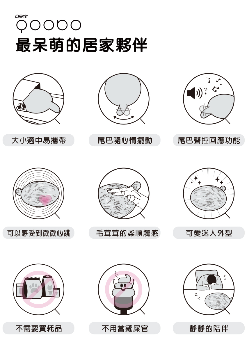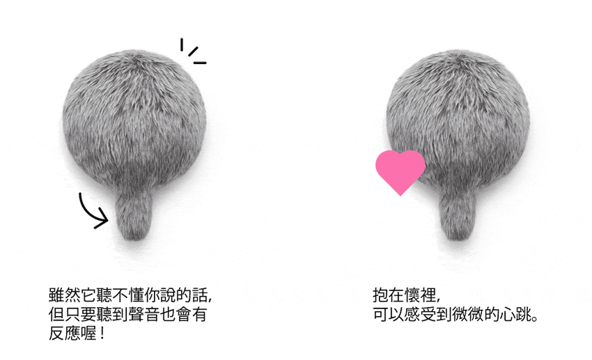With the new "voice control" feature, Petit Qoobo will wag its tail in response to any sound you make! When held, you can feel a gentle heartbeat vibration.
