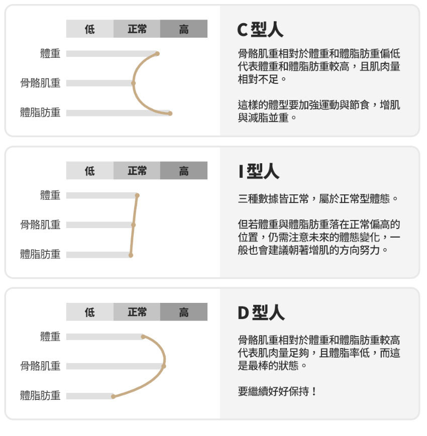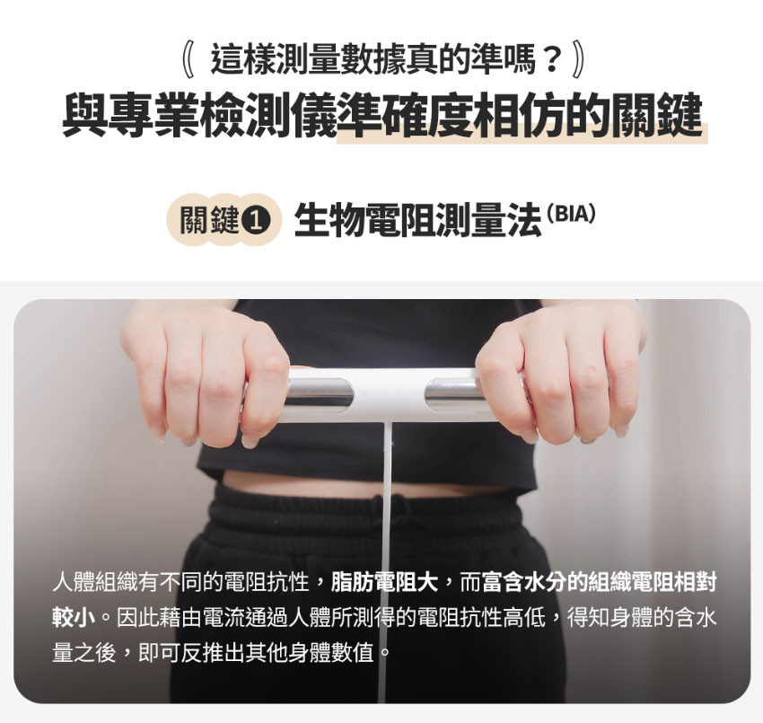 使用雙頻測量技術,高頻檢測細胞內液,低頻測量細胞外液的水分,從而透過不同的電阻抗性,富含水分的組織電阻相對較小,得知身體的含水量後,即可反推出其他身體數值。