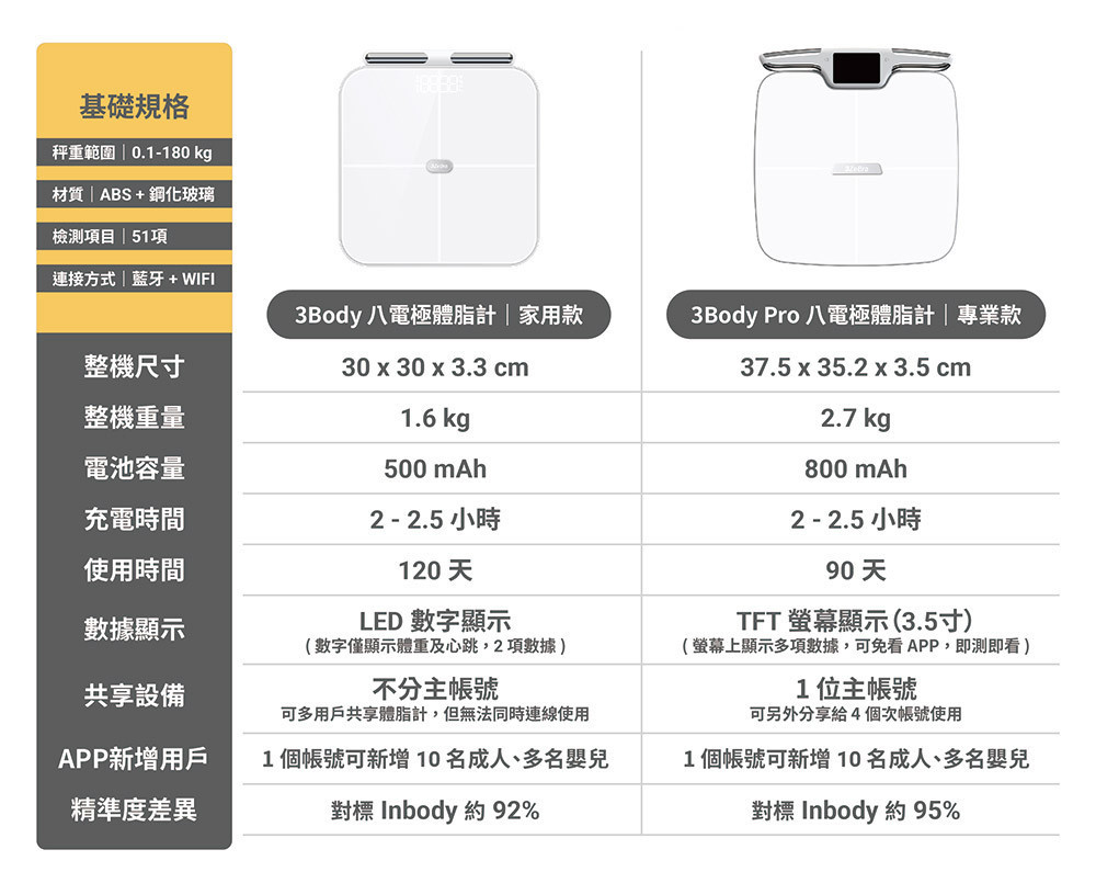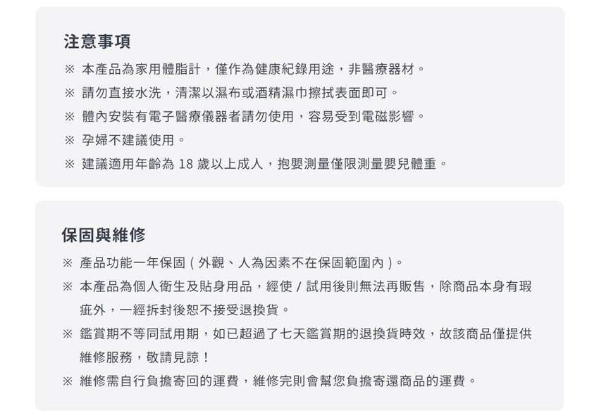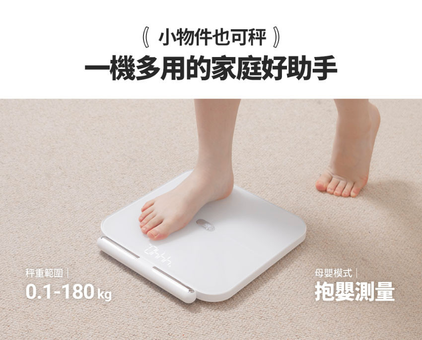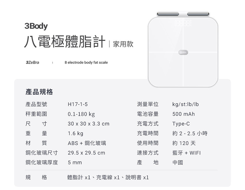3. 產品內容:體脂計×1、充電線×1、說明書×1
