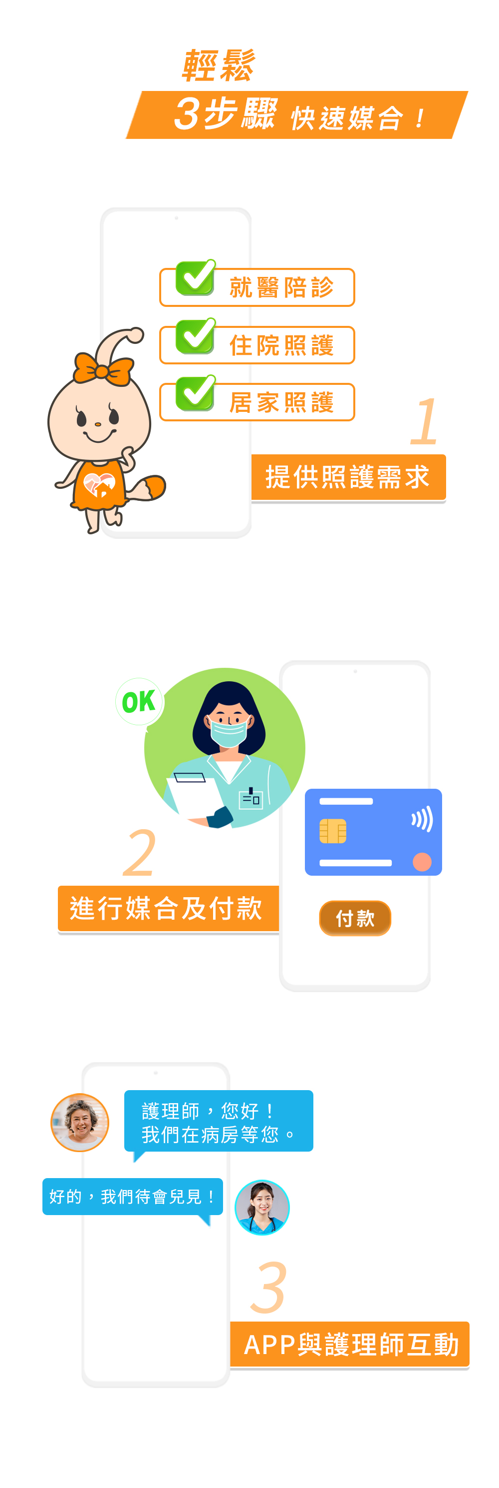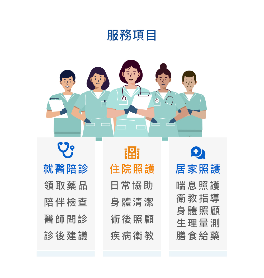 This platform offers a range of short-term care services, including "hospital care," "home care," and "medical accompaniment."