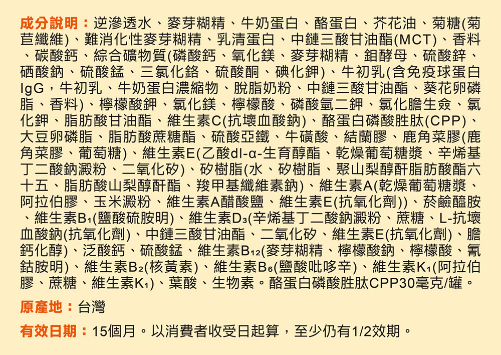 5. Ingredients: Reverse osmosis water, maltodextrin, milk protein, casein, canola oil, chicory inulin, indigestible maltodextrin, whey protein, medium-chain triglycerides (MCT), flavoring, calcium carbonate, complex minerals (calcium phosphate, magnesium oxide, maltodextrin, molybdenum yeast, zinc sulfate, sodium selenate, manganese sulfate, chromium trichloride, potassium iodide), colostrum (contains immunoglobulin IgG), milk protein concentrate, skimmed milk powder, sunflower lecithin, flavoring, potassium citrate, magnesium chloride, citric acid, dipotassium phosphate, choline chloride, potassium chloride, glycerol fatty acid esters, vitamin C (sodium ascorbate), casein phosphopeptide (CPP), soy lecithin, sucrose fatty acid esters, ferrous sulfate, taurine, xanthan gum, carrageenan (carrageenan, glucose), vitamin E (dl-α-tocopheryl acetate, dried glucose syrup, sodium octenyl butyl succinate starch, silica), silicon resin (water, silicon resin, polysorbate 65, sorbitan fatty acid esters, sodium carboxymethyl cellulose), vitamin A (dried glucose syrup, gum arabic, corn starch, vitamin A acetate, vitamin E (antioxidant)), niacinamide, vitamin B1 (thiamine hydrochloride), vitamin D3 (sodium octenyl butyl succinate starch, sucrose, L-ascorbic acid sodium (antioxidant), MCT, silica, vitamin E (antioxidant), cholecalciferol), calcium pantothenate, manganese sulfate, vitamin B12 (maltodextrin, sodium citrate, citric acid, cyanocobalamin), vitamin B2 (riboflavin), vitamin B6 (pyridoxine hydrochloride), vitamin K1 (gum arabic, sucrose, vitamin K1), folic acid, biotin. Contains 30mg of casein phosphopeptide (CPP) per can.