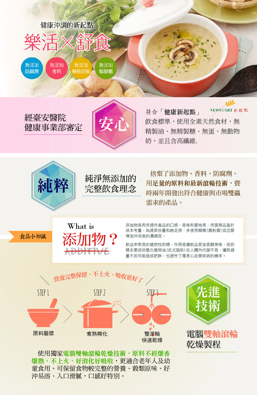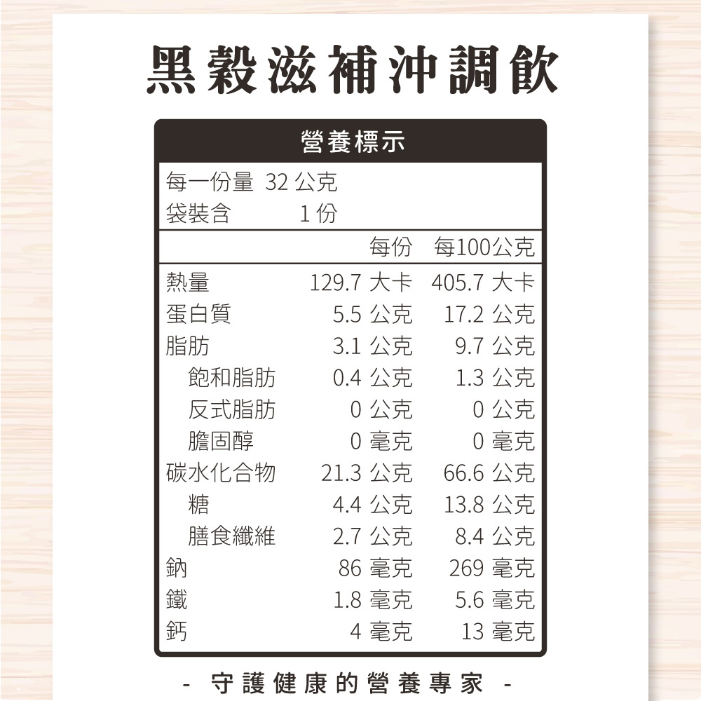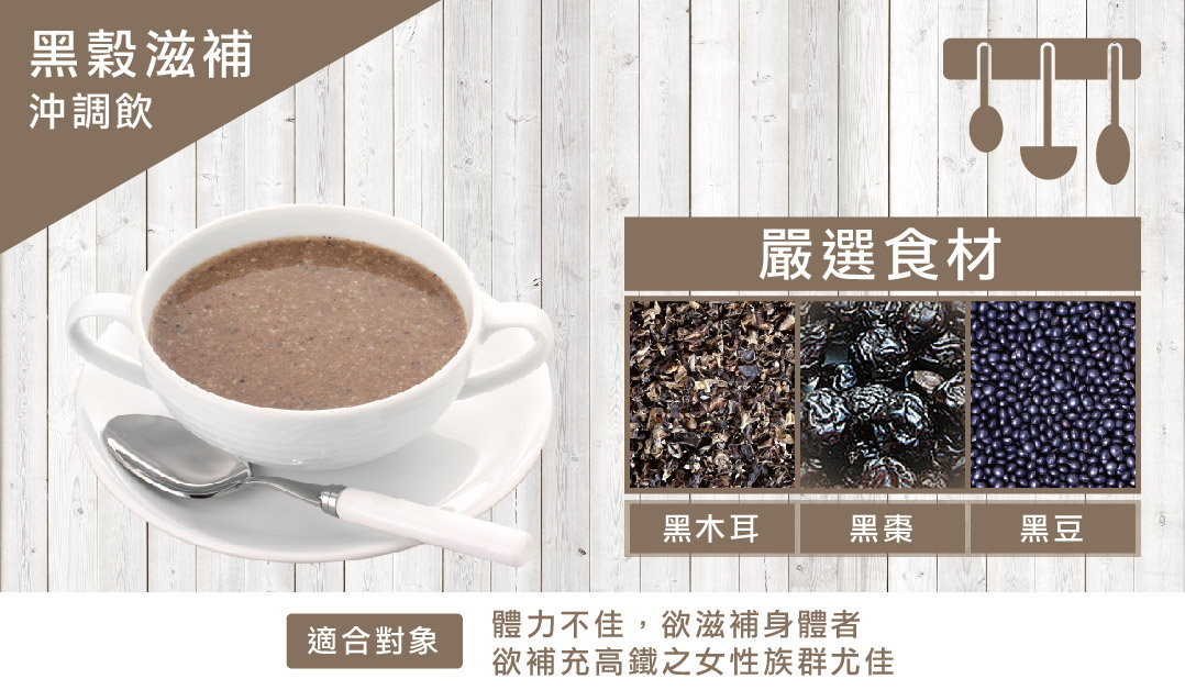 The Black Grain Nutritional Drink Mix, honored with the "Eatender" Friendly Food award for seniors in 2021, is formulated and approved by the Health Development Department of Tai-An Hospital. It features five types of beneficial all-natural black ingredients and Chinese medicinal herbs, with no refined oils, refined sugars, eggs, or animal milk. It is high in iron, dietary fiber, and cholesterol-free.