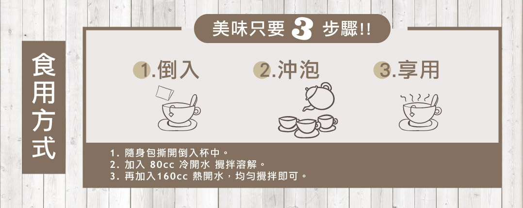 - Consumption Method: Tear open the packet and pour into a cup. Add ⅓ cold boiled water and stir to dissolve. Then add ⅔ hot boiled water and mix well before enjoying.