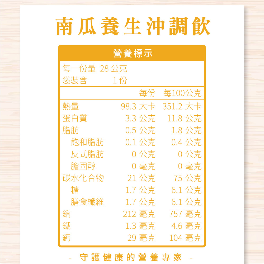 Pumpkin Health Drink Mix - Corn (non-GMO), soybeans (non-GMO), job’s tears, brown rice, oat flakes, cabbage, rock salt, yeast extract, pumpkin, seaweed sprouts, carrot, beer yeast, brown sugar, β-carotene (coloring agent), diced pumpkin, germinated brown rice, pumpkin seeds, celery, millet
