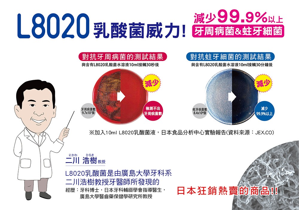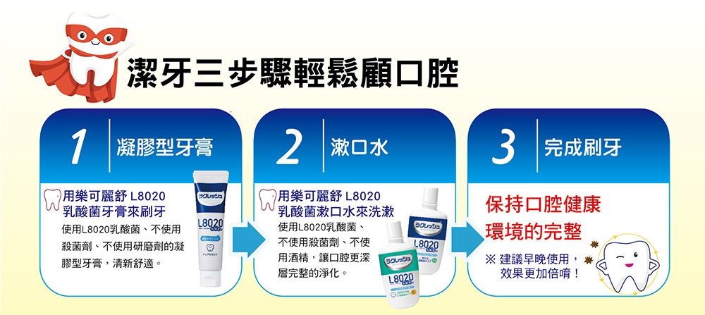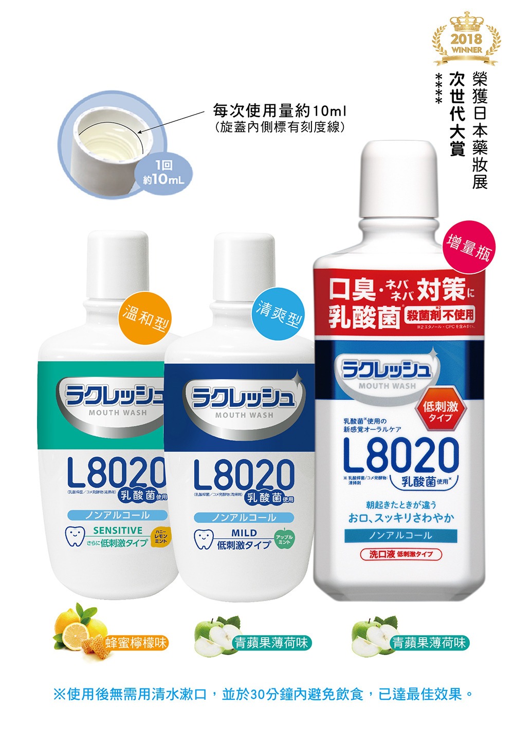 EZ66 recommends【Recolisho】L8020 Lactobacillus Mouthwash, a mouthwash containing lactobacilli that promotes "having 20 healthy teeth at the age of 80." This product has won the Next Generation Award at the Japan Drugstore Show. Using just 10 ml for 30 seconds can effectively eliminate 99.9% of cavity-causing bacteria and periodontal bacteria. With a gentle formula that contains no antiseptics, it provides an unprecedented refreshing and comfortable sensation, helping restore the oral environment to its original purity.