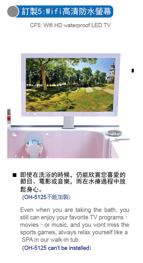Wifi HD waterproof LED TV | ![]() | You can enjoy your favorite shows, movies, or music even while bathing, relaxing your mind and body during the hydrotherapy process. (OH-5125 model cannot be installed.) | 22,000NT dollars |