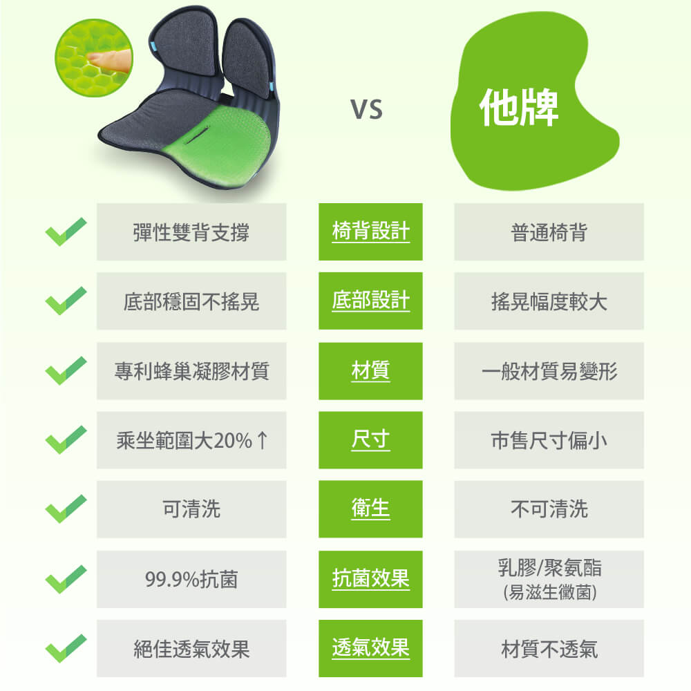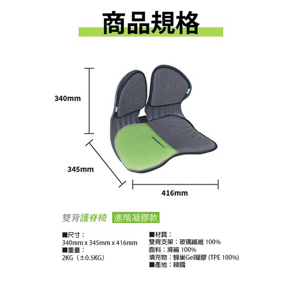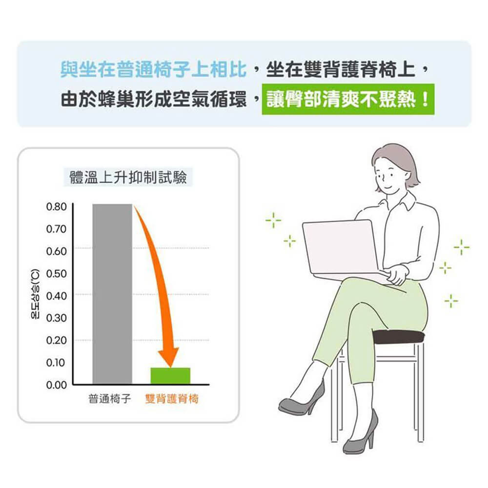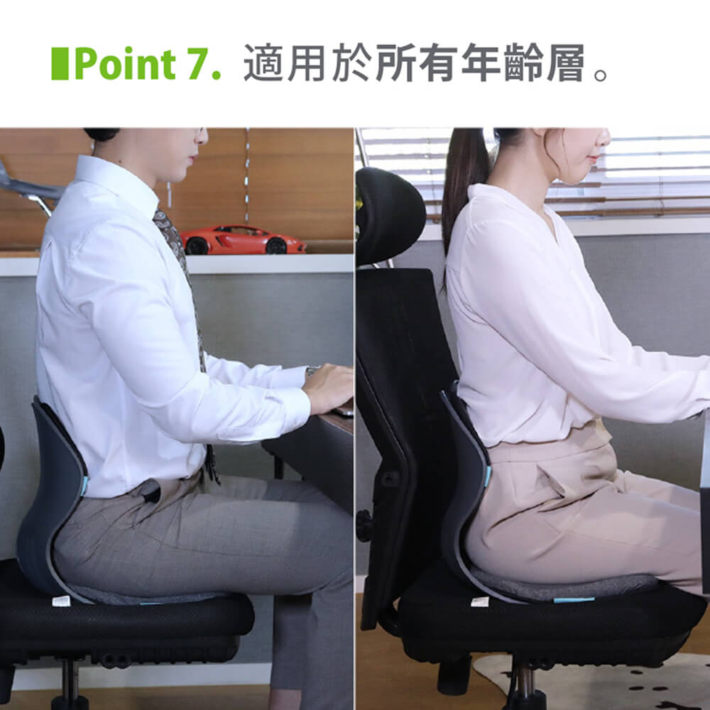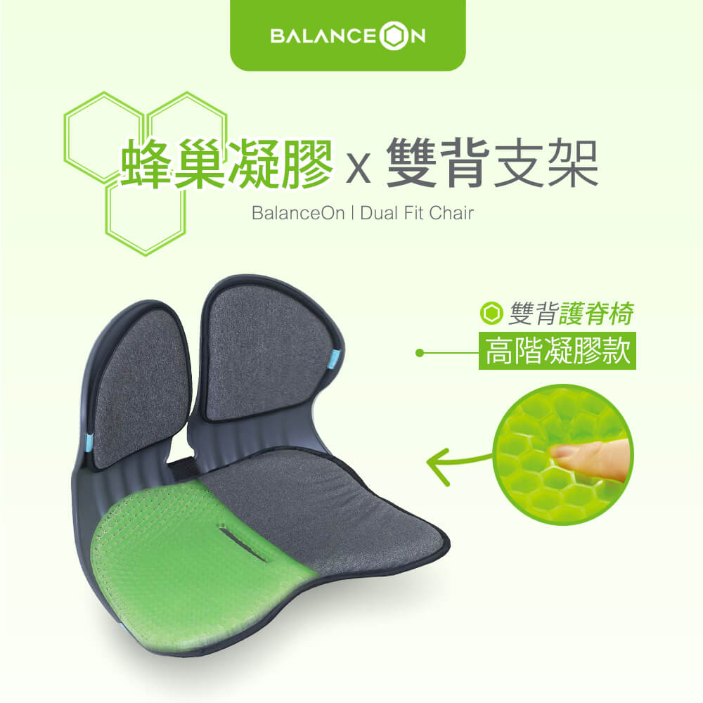 此款【BALANCE ON】倍力舒 蜂巢凝膠雙背護脊椅,專利六角蜂巢凝膠結構,有效減緩壓力,雙背支撐設計,貼合背部曲線,有效穩定腰部和臀部,支撐核心肌群,自然地將尾椎和脊柱保持在最佳角度。任何場所都適用,特別推薦給長期坐在椅子上的長輩、或上班族。