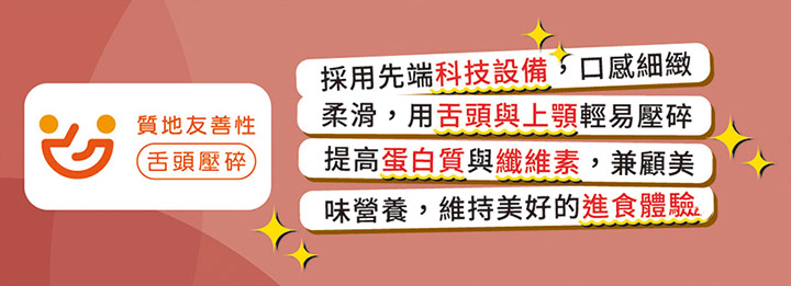 2. 國內首創常溫塑型軟排質地調整餐,採用先端科技設備,口感細緻柔滑,質地均一,常溫儲存,攜帶方便。
