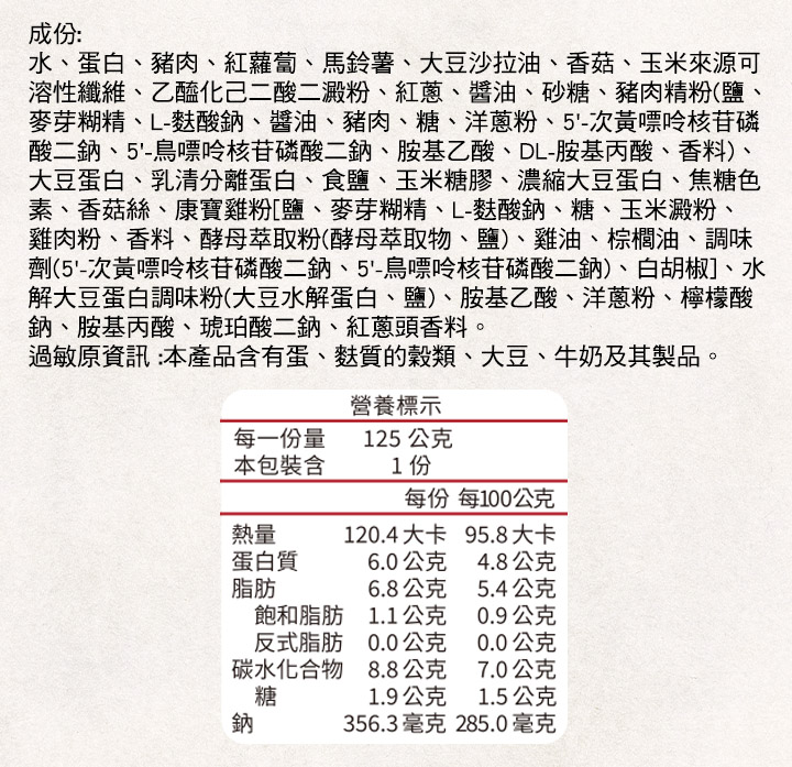 8. 成分:水、蛋白、豬肉(原產地:台灣)、紅蘿蔔、馬鈴薯、大豆沙拉油、香菇、玉米來源可溶性纖維、乙醯化己二酸二澱粉、紅蔥、醬油、砂糖、豬肉精粉[鹽、麥芽糊精、L-麩酸鈉、醬油、豬肉(原產地:台灣)、糖、洋蔥粉、5'-次黃嘌呤核苷磷酸二鈉、5'-鳥嘌呤核苷磷酸二鈉、胺基乙酸、DL-胺基丙酸、香料)、大豆蛋白、乳清分離蛋白(乳清分離蛋白、大豆卵磷脂)、食鹽、玉米糖膠、濃縮大豆蛋白、焦糖色素、香菇絲、雞粉[鹽、麥芽糊精、L-麩酸鈉、糖、玉米澱粉、雞肉粉、香料、酵母萃取粉(酵母萃取物、鹽)、雞油、棕櫚油(棕櫚油、硬質棕櫚油)、調味劑(5'-次黃嘌呤核苷磷酸二鈉、5'-鳥嘌呤核苷磷酸二鈉)、白胡椒]、水解大豆蛋白調味粉(大豆水解蛋白、鹽)、胺基乙酸、洋蔥粉、檸檬酸鈉、DL-胺基丙酸、琥珀酸二鈉、紅蔥頭香料。