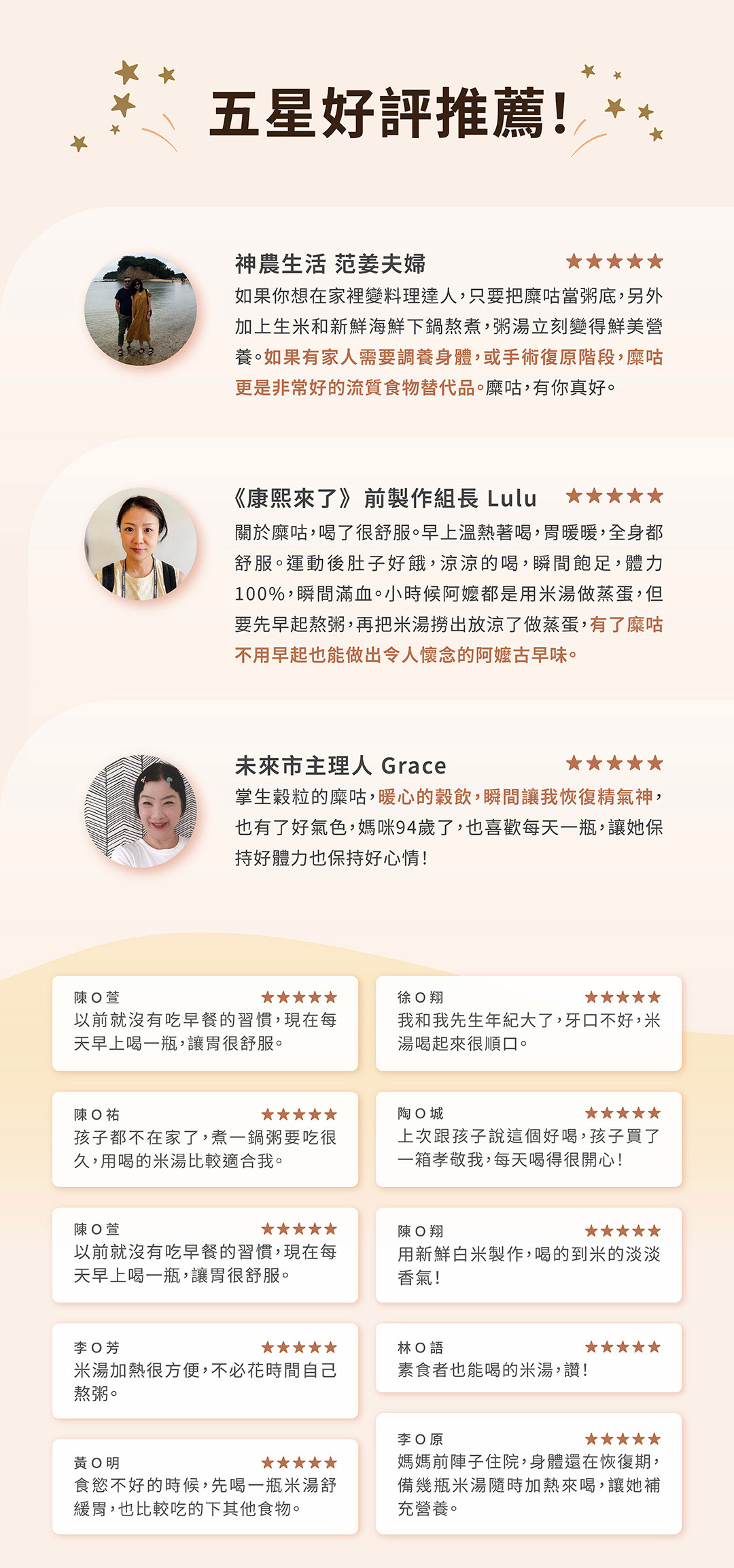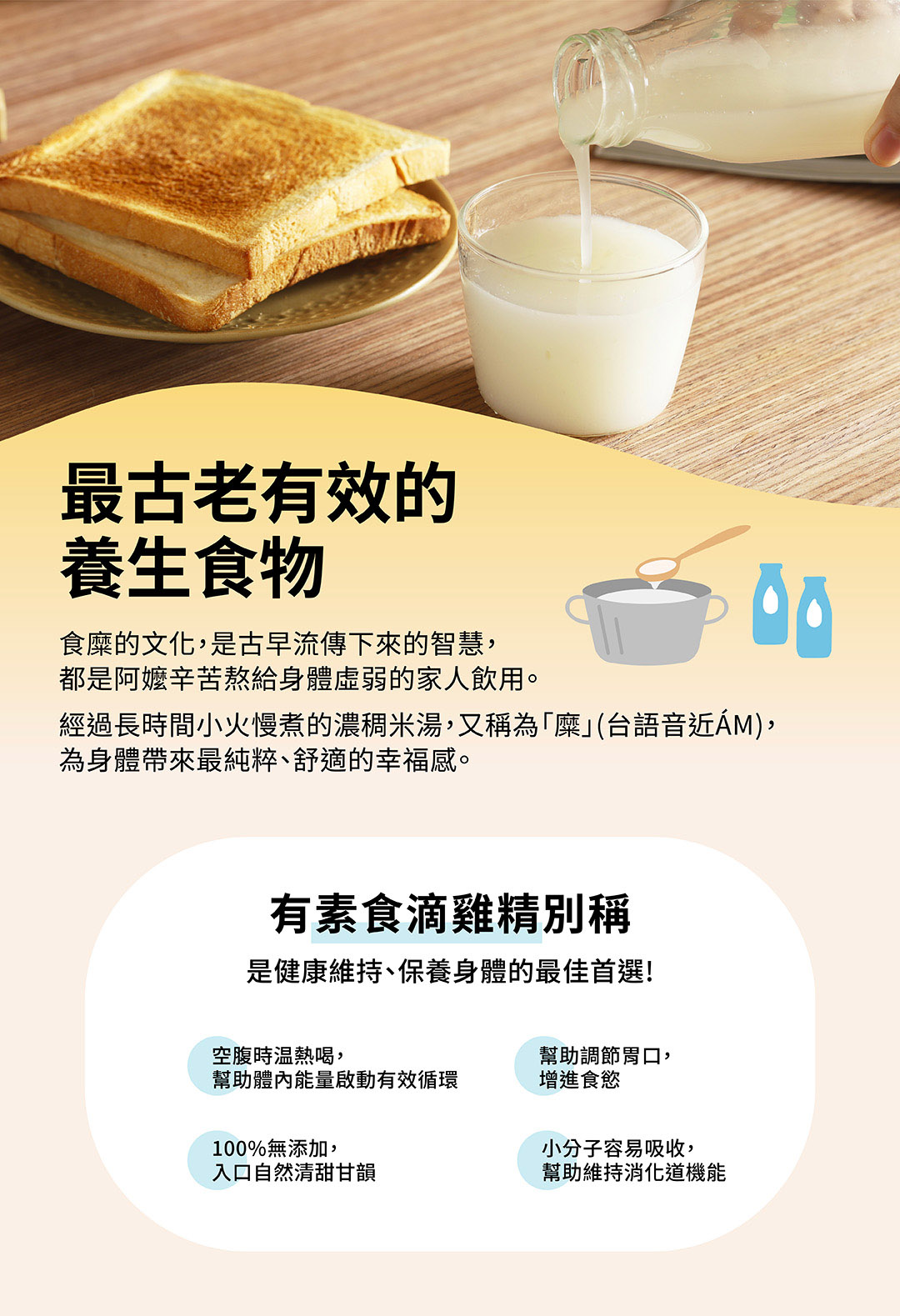 1. 是否擔心長輩因牙口不佳或消化不良,無法攝取足夠營養?【掌生穀粒】糜咕熬米湯,專為銀髮族設計,選用優質糙米細火慢熬,口感滑順細膩,容易入口、好吸收,給長輩最溫和的營養補給。米湯富含豐富的維生素與礦物質,不僅幫助消化,更能增強體力,讓身體更有抵抗力。無論是早餐、點心或輕食,這款米湯都是長輩理想的日常營養選擇,為他們的健康保駕護航。
