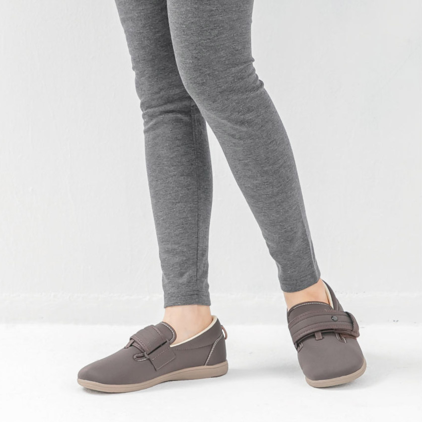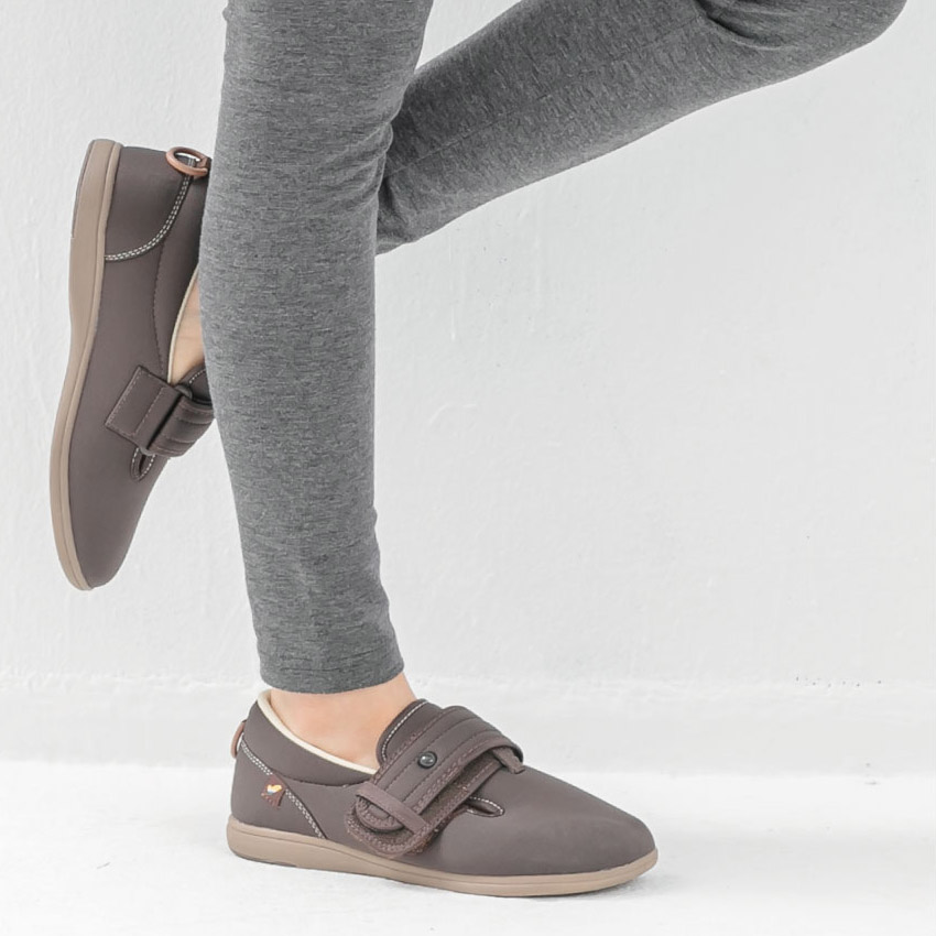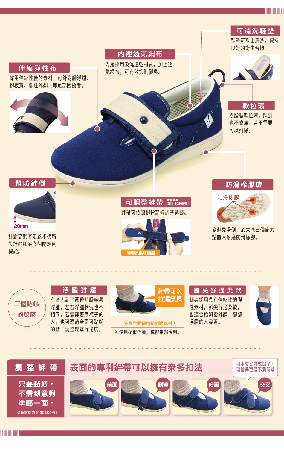 使用伸縮性佳的彈性布料,搭配專利絆帶設計,可依個人調整至合腳,讓腳容易浮腫的長者也能穿得舒服;鞋前端底部微翹、避免絆倒,無論是復健、室內、室外都適合穿,處處皆是無微不至的貼心設計。