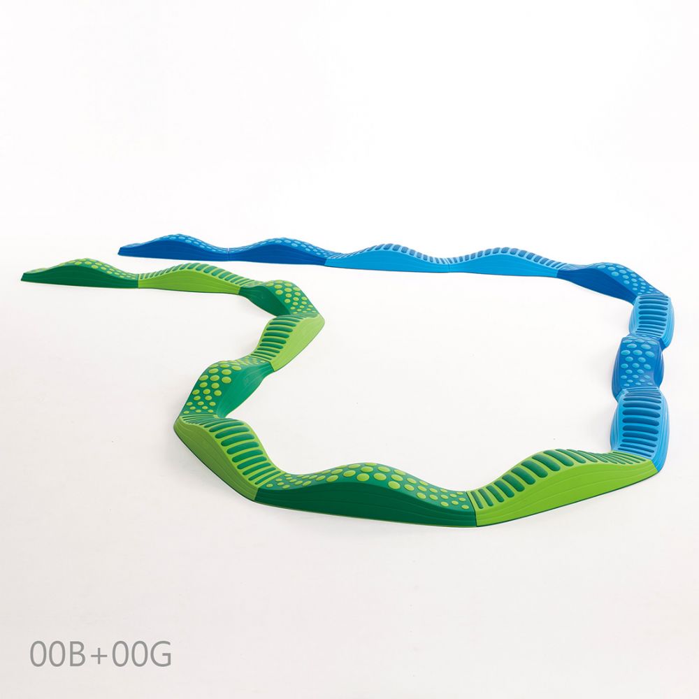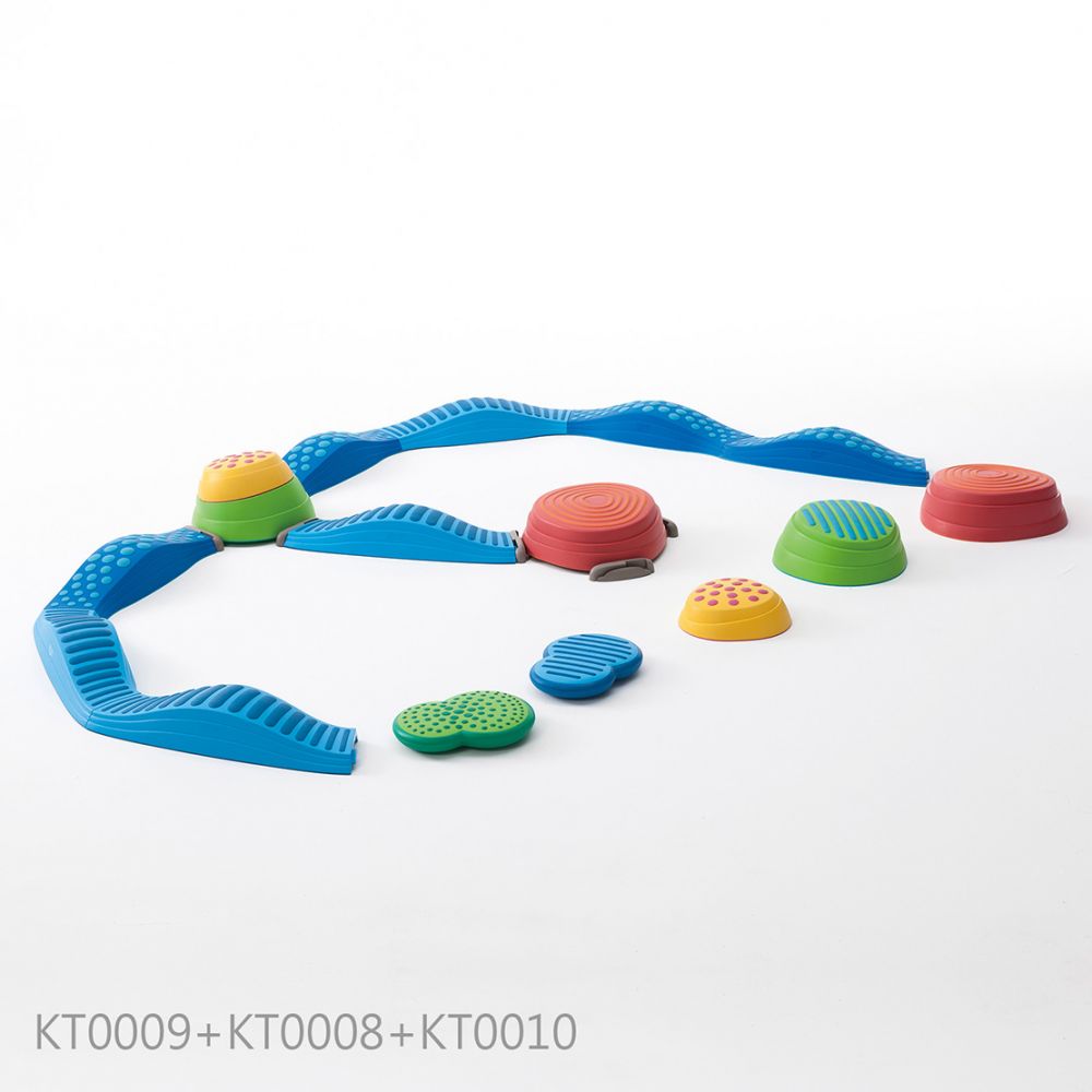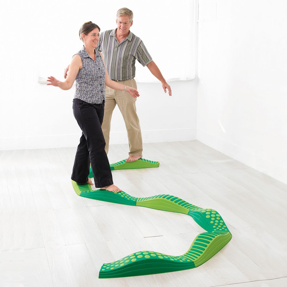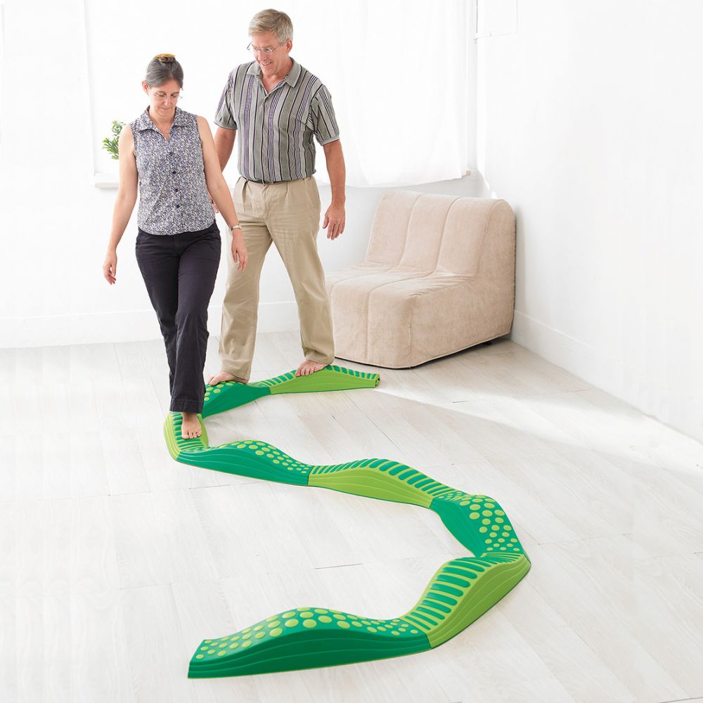 彷彿鄉間小道,組合多元化,提供循環、繞圈行走,幫助銀髮族身體重心。不同弧度讓腳板感受坡度變化,凸起紋路提供和緩的腳底觸覺刺激。