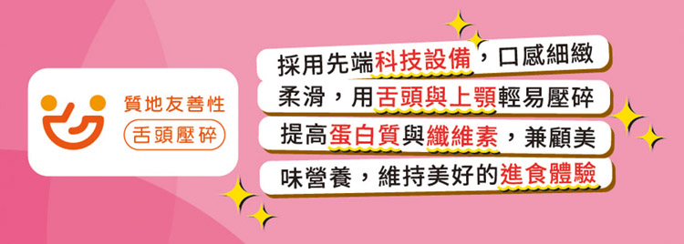 2. 國內首創常溫塑型軟排質地調整餐,採用先端科技設備,口感細緻柔滑,質地均一,常溫儲存,攜帶方便。