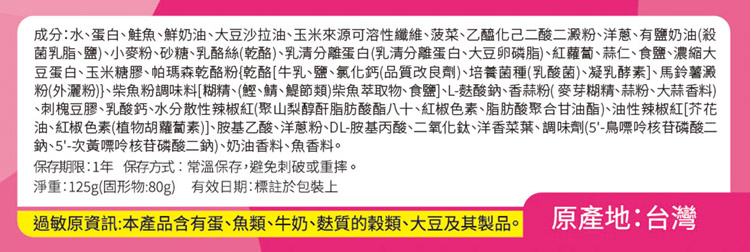 7. 成分:水、蛋白、鮭魚、鮮奶油、大豆沙拉油、玉米來源可溶性纖維、菠菜、乙醯化己二酸二澱粉、洋蔥、有鹽奶油(殺菌乳脂、鹽)、小麥粉、砂糖、乳酪絲(乾酪)、乳清分離蛋白(乳清分離蛋白、大豆卵磷脂)、紅蘿蔔、蒜仁、食鹽、濃縮大豆蛋白、玉米糖膠、帕瑪森乾酪粉{乾酪[牛乳、鹽、氯化鈣(品質改良劑)、培養菌種(乳酸菌)、凝乳酵素]、馬鈴薯澱粉(外灑粉)}、柴魚粉調味料[糊精、(鰹、鯖、鯷節類)柴魚萃取物、食鹽]、L-麩酸鈉、香蒜粉(麥芽糊精、蒜粉、大蒜香料)、刺槐豆膠、乳酸鈣、水分散性辣椒紅(聚山梨醇酐脂肪酸酯八十、紅椒色素、脂肪酸聚合甘油酯)、油性辣椒紅[芥花油、紅椒色素(植物胡蘿蔔素)]、胺基乙酸、洋蔥粉、DL-胺基丙酸、二氧化鈦、洋香菜葉、調味劑(5'-鳥嘌呤核苷磷酸二鈉、5'-次黃嘌呤核苷磷酸二鈉)、奶油香料、魚香料。