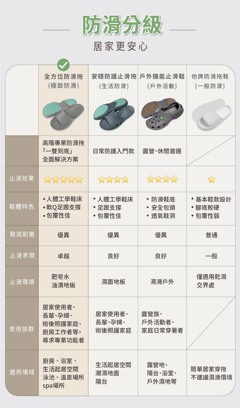 樂齡網推薦此款【伴佳家】全方位居家防護止滑拖,獨家防油防滑設計鞋底,防滑係數高達安全等級!30mm減震厚底,緩衝足部踩踏壓力,輕便舒適好行走、台灣製,鞋型符合台灣人腳型、採用環保EVA材質對環境人體友善。