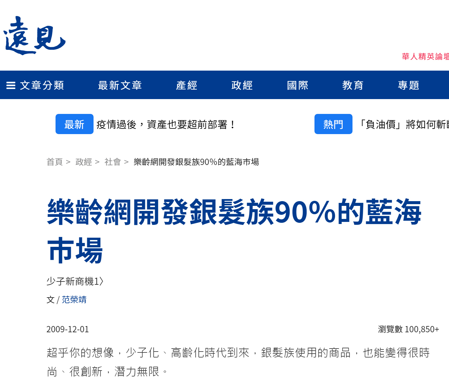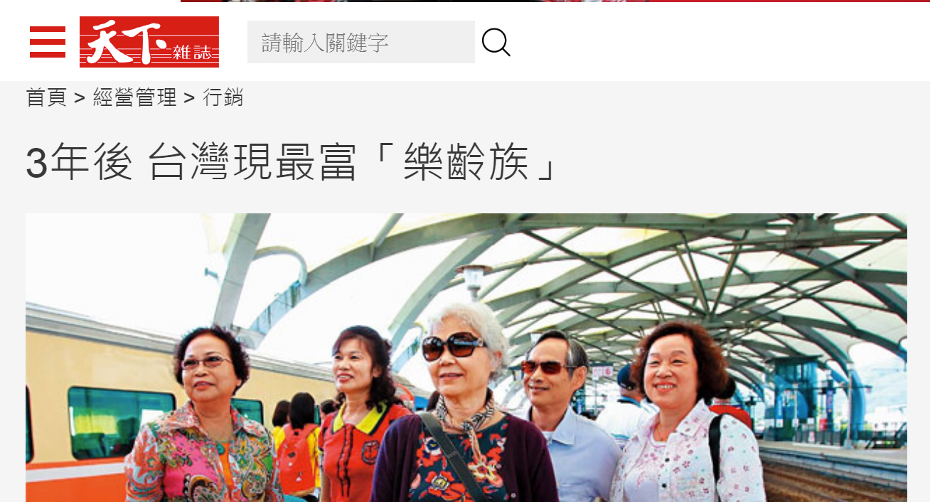 台灣很快就會從高齡社會邁入「超高齡社會」,老化速度相當快,戰後嬰兒潮從農業時代一路創造經濟奇蹟,特色是壽命高、學識高、財富高,工研院曾經估計,2025年台灣的銀髮消費市場規模將達3.6兆元,縱觀全球,老年群體將在未來15年,成為最龐大的消費族群。