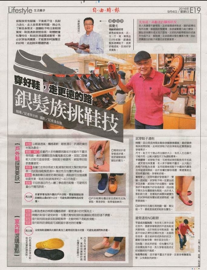 【報紙】自由時報 2016/9/5銀髮族挑鞋技報導,樂齡網張董事長擔任選鞋達人。