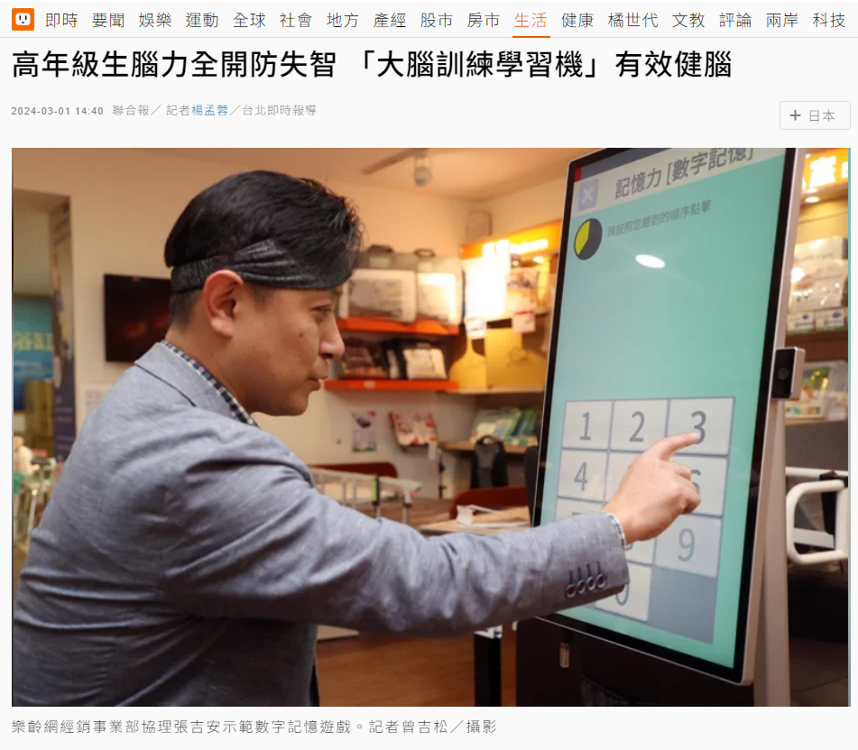 台北市中山區行仁里的社區照顧關懷據點,一名九十五歲的阿公在玩「數字記憶」遊戲,一邊聽題目,一邊認真在螢幕上作答,遊戲結束,腦活躍度獲得72高分,引起現場拍手稱讚。