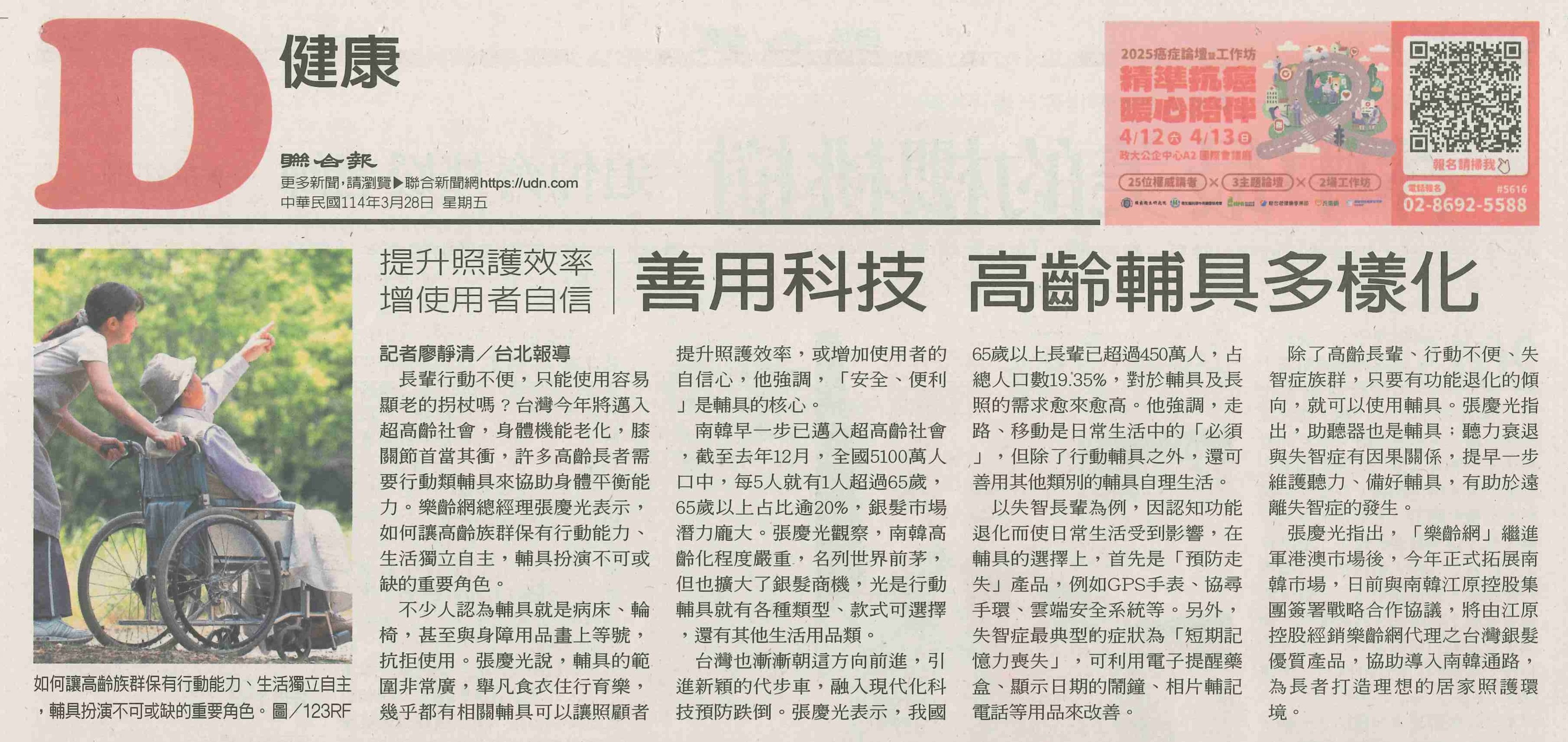 南韓早一步已邁入超高齡社會,截至去年12月,全國5100萬人口中,每5人就有1人超過65歲,65歲以上占比逾20%,銀髮市場潛力龐大。張慶光觀察,南韓高齡化程度嚴重,名列世界前茅,但也擴大了銀髮商機,光是行動輔具就有各種類型、款式可選擇,還有其他生活用品類。