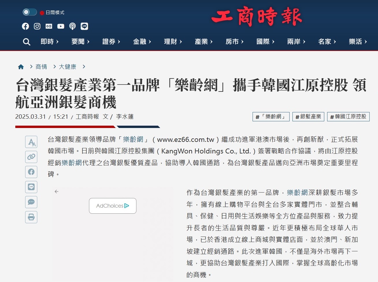 【 工商時報】台灣銀髮產業第一品牌「樂齡網」攜手韓國江原控股 領航亞洲銀髮商機