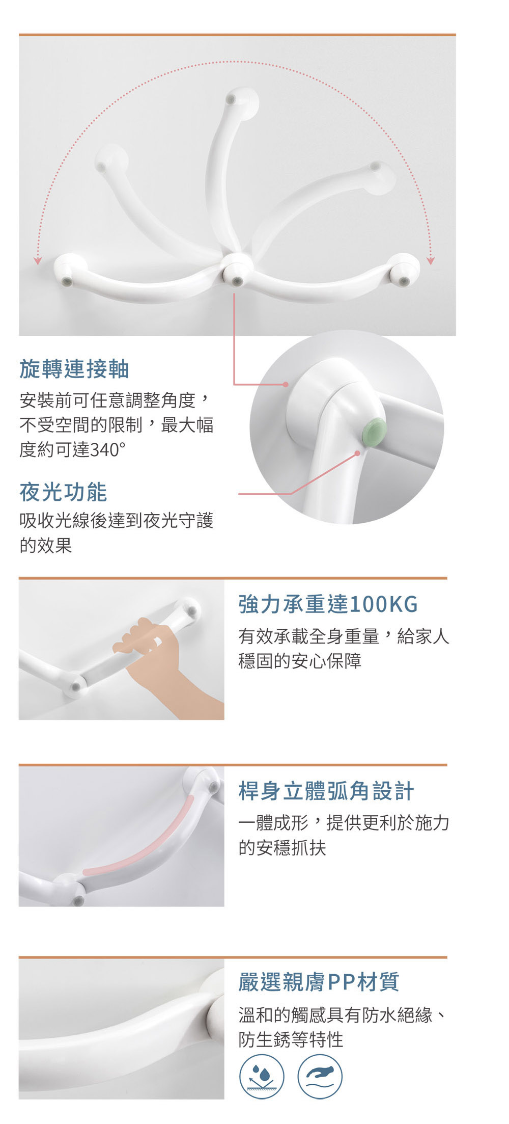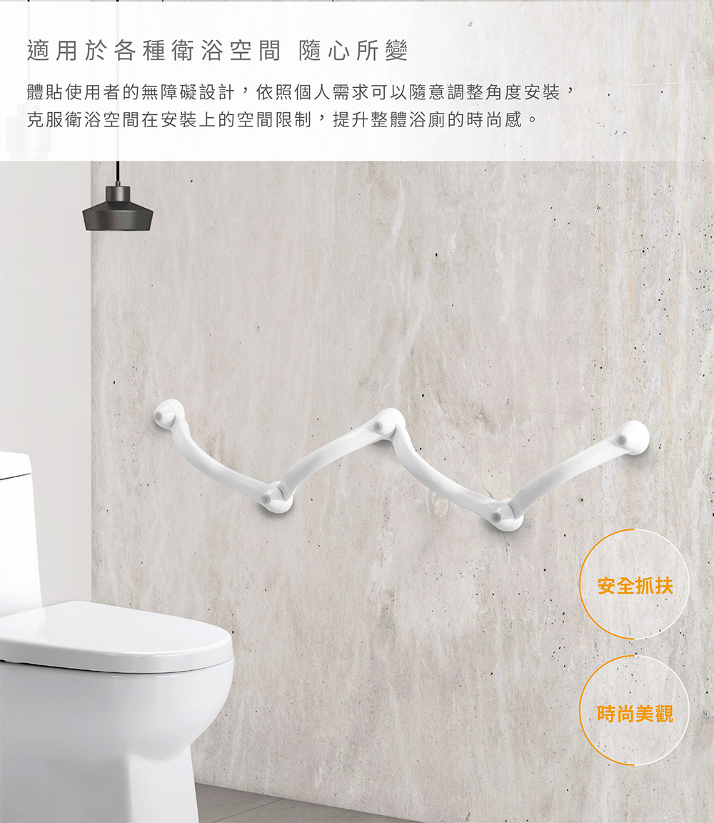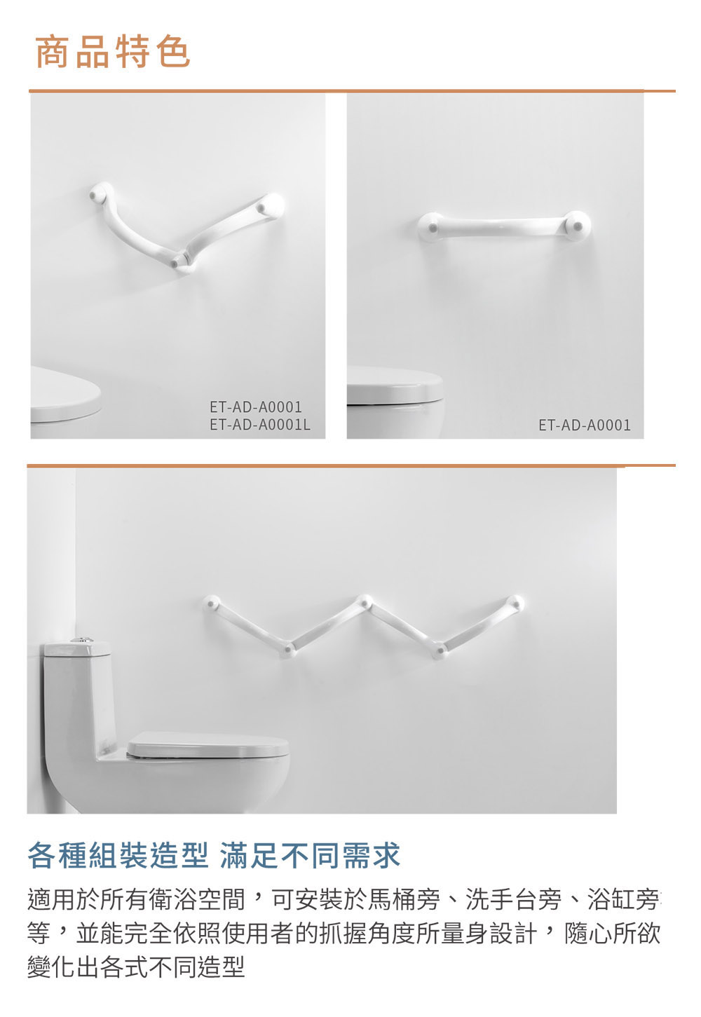 長輩在家中跌倒的機率極高,尤其是在潮濕的浴廁空間裡,無論是馬桶旁、洗手台旁、浴缸旁,處處危機四伏!樂齡網推薦【ITAI】百變扶手,有標準段、加長段,可以搭配結合延伸,依照使用者的長度需求及抓握角度,組合出各種運用變化,來協助浴廁中的起身和移動能更安穩。