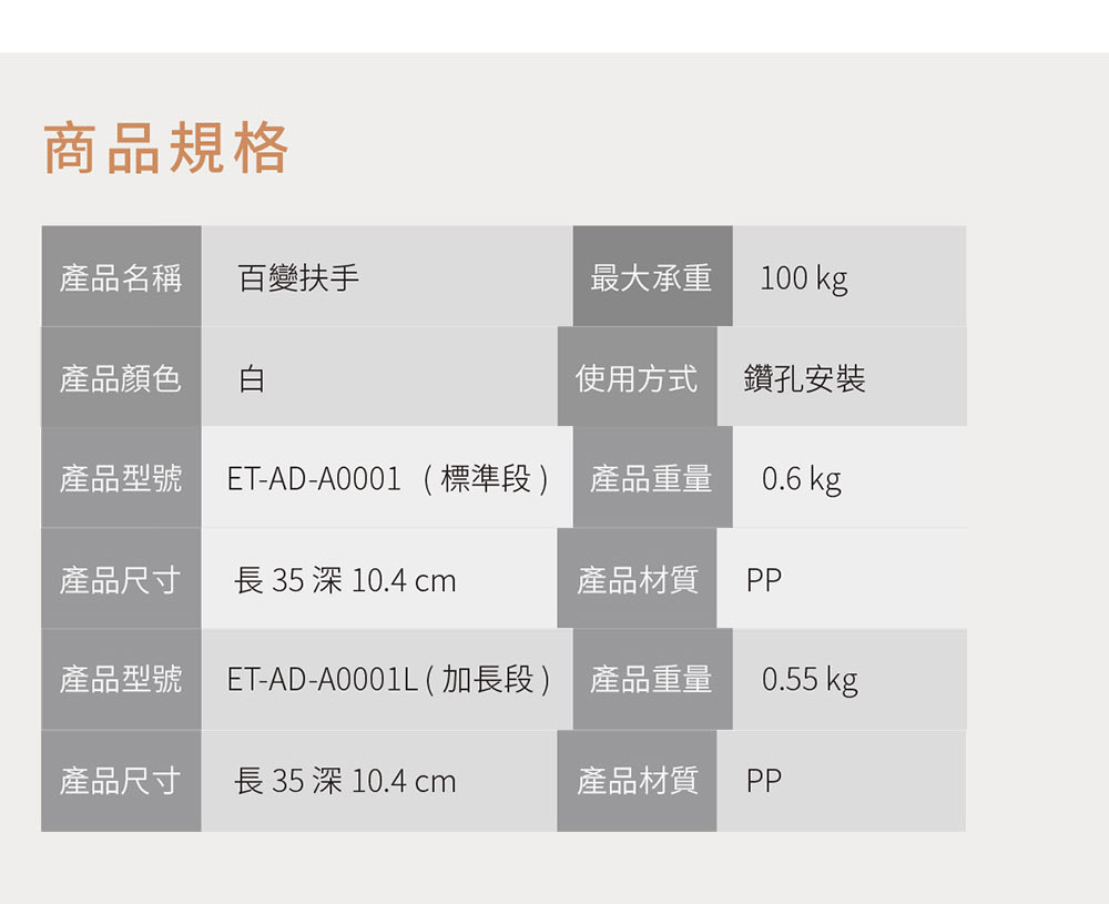 1. 此產品符合長照2.0/身心障礙者輔具補助項目【居家無障礙設施-扶手(每十公分)】