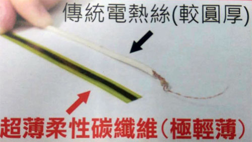 1. 輕薄舒適:使用厚度僅0.45mm的碳纖維片發熱(一般傳統電熱絲圓厚度約2.5 -3.0mm),不會造成身體接觸時的不舒適(一般使用電熱絲會突出,躺在電線上不舒服)。