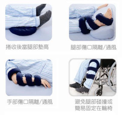 此商品是避免手、腳、關節不自主碰撞或摩擦外物而受傷,或隔離傷口,避免傷口直接與床面摩擦或悶濕,並可當成簡易固定/約束帶使用。