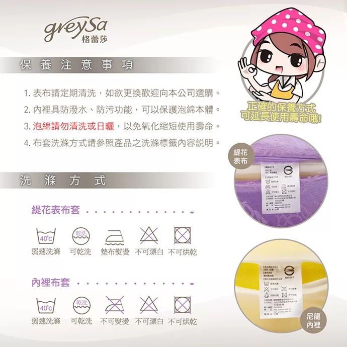 • 填充物:獨家設計 GreySa 緹花布 (60%棉+40%聚酯纖維)