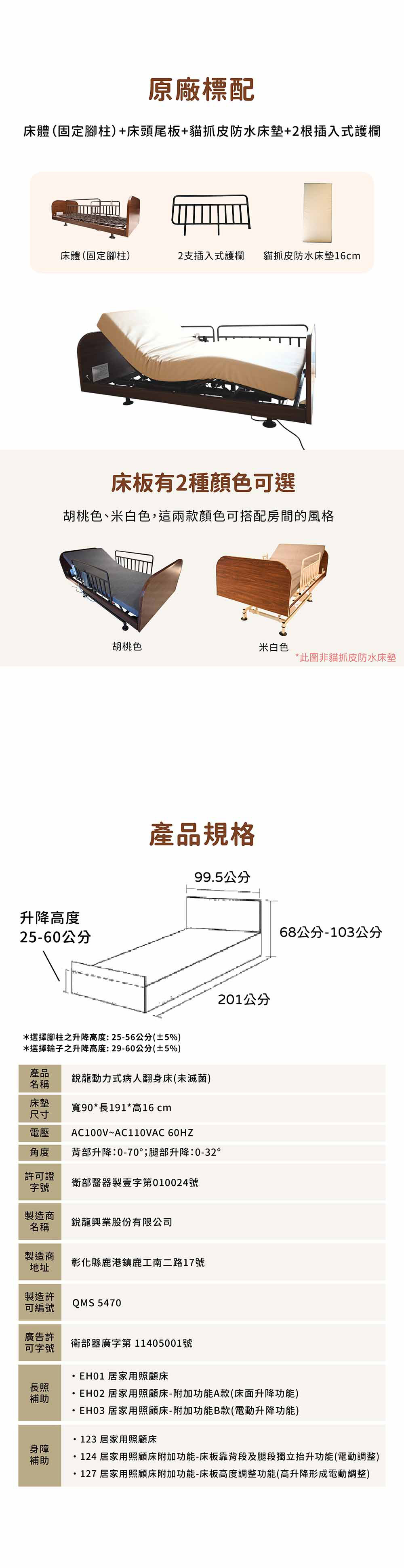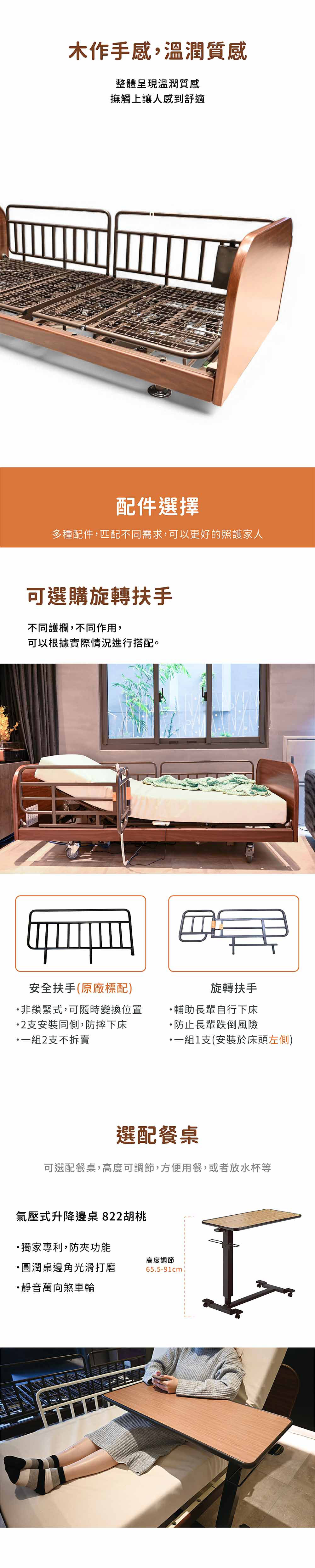 【居家用照顧床 + 附加功能-床板靠背段及腿段獨立抬升功能(電動調整) + 附加功能-床板高度調整功能(高升降行程電動調整)】