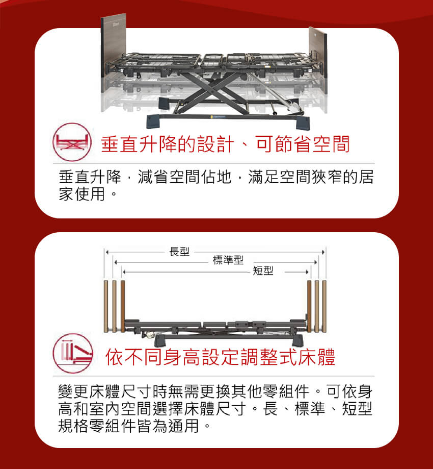 【居家用照顧床 + 附加功能-床板靠背段及腿段獨立抬升功能(電動調整) + 附加功能-床板高度調整功能(高升降行程電動調整)】
