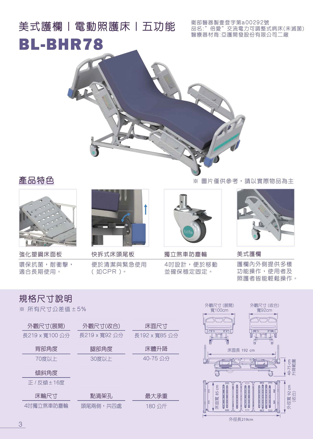 【倍愛】四馬達電動照護床 BL-BHR78 四片式護欄 - "倍愛" 交流電力可調整式病床 (未滅菌)【B2BD4133GRA0000】