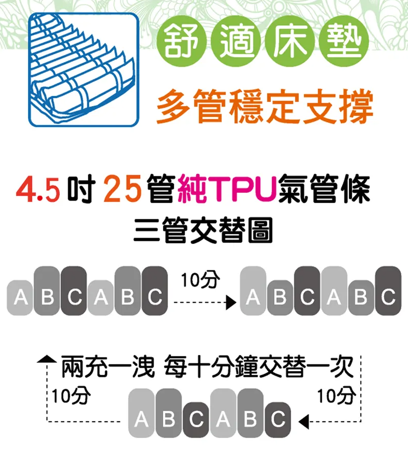 固定時間作充洩交替動作,借由氣管高低軟硬變化定時改變身體受壓分布,減少處在持續單點壓迫而產生壓瘡的風險。