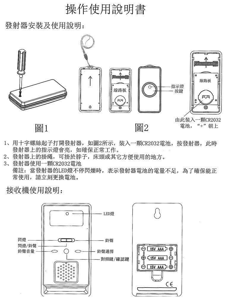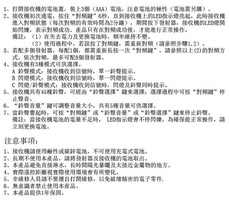 5. 電源:接收器使用3顆AAA鹼性或碳鋅電池(即一般乾電池,勿使用充電電池),發射器使用CR2032電池。