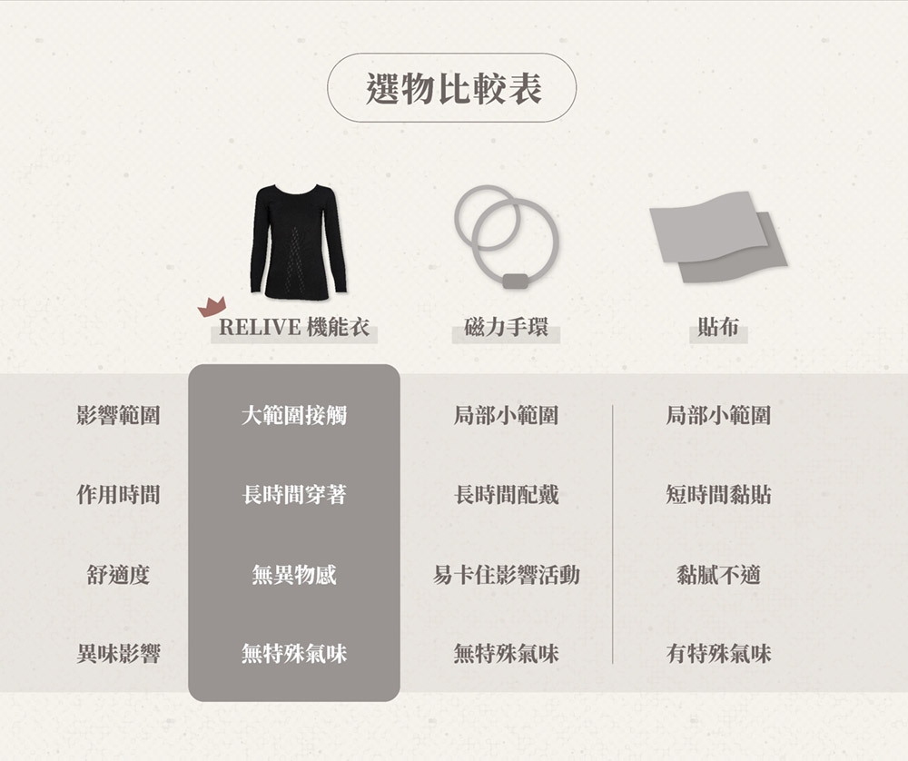相較於局部作用的產品(如項圈、手環等),RELIVE 機能衣能大面積接觸身體,將健康效益全面覆蓋。