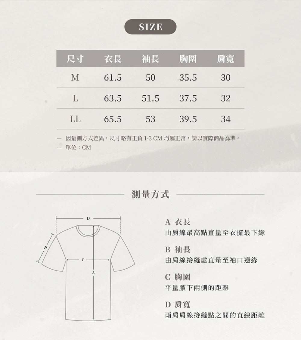 • M - 衣長61.5cm / 袖長50cm / 胸寬35.5cm / 肩寬30cm / 適合身高152~162cm