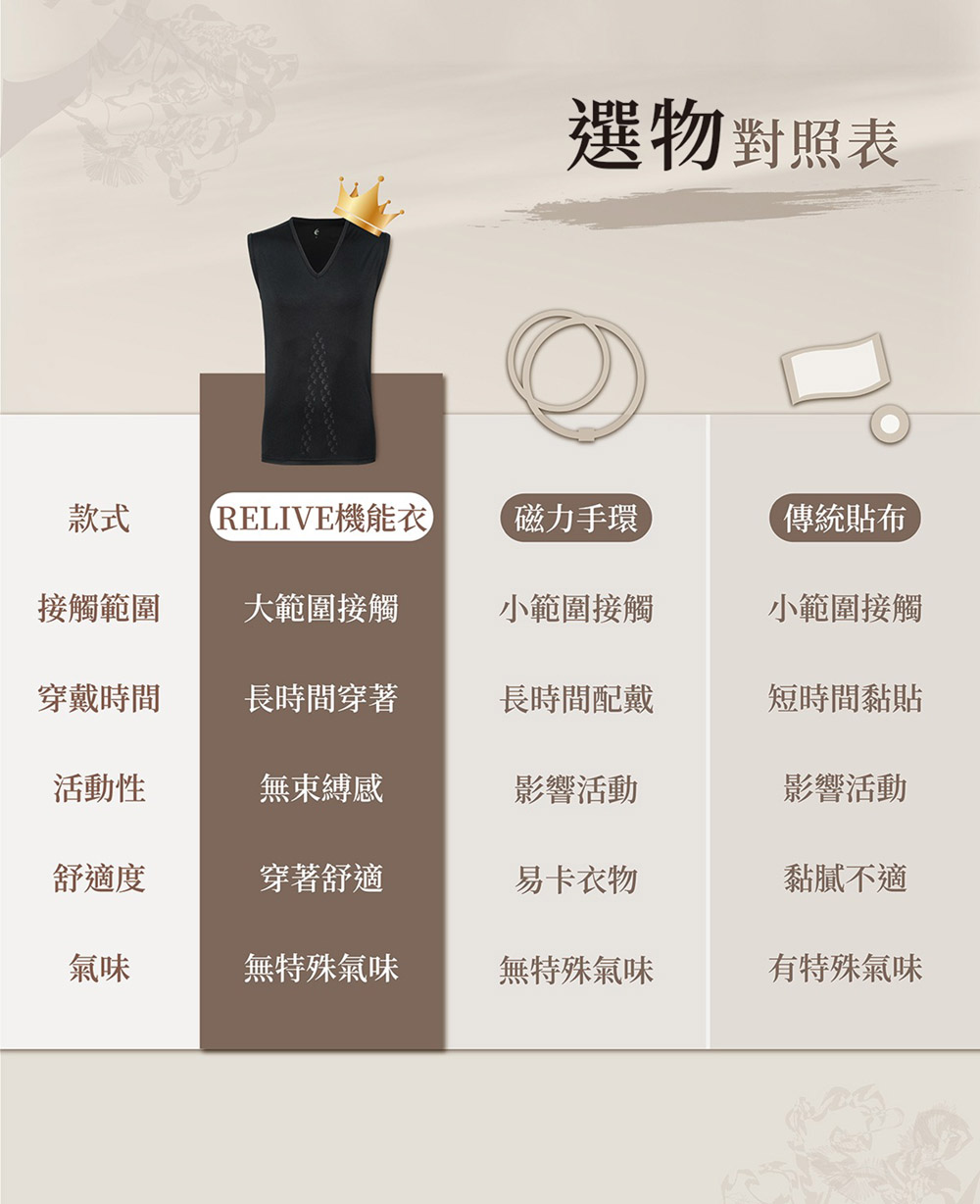 相較於局部作用的產品(如項圈、手環等),RELIVE 機能衣能大面積接觸身體,將健康效益全面覆蓋。