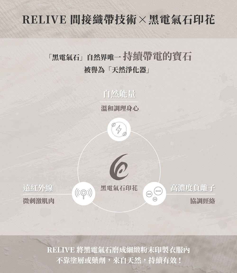 RELIVE 的核心技術在於黑電氣石,這是一種經科學研究證實能夠釋放負離子與遠紅外線的天然礦石