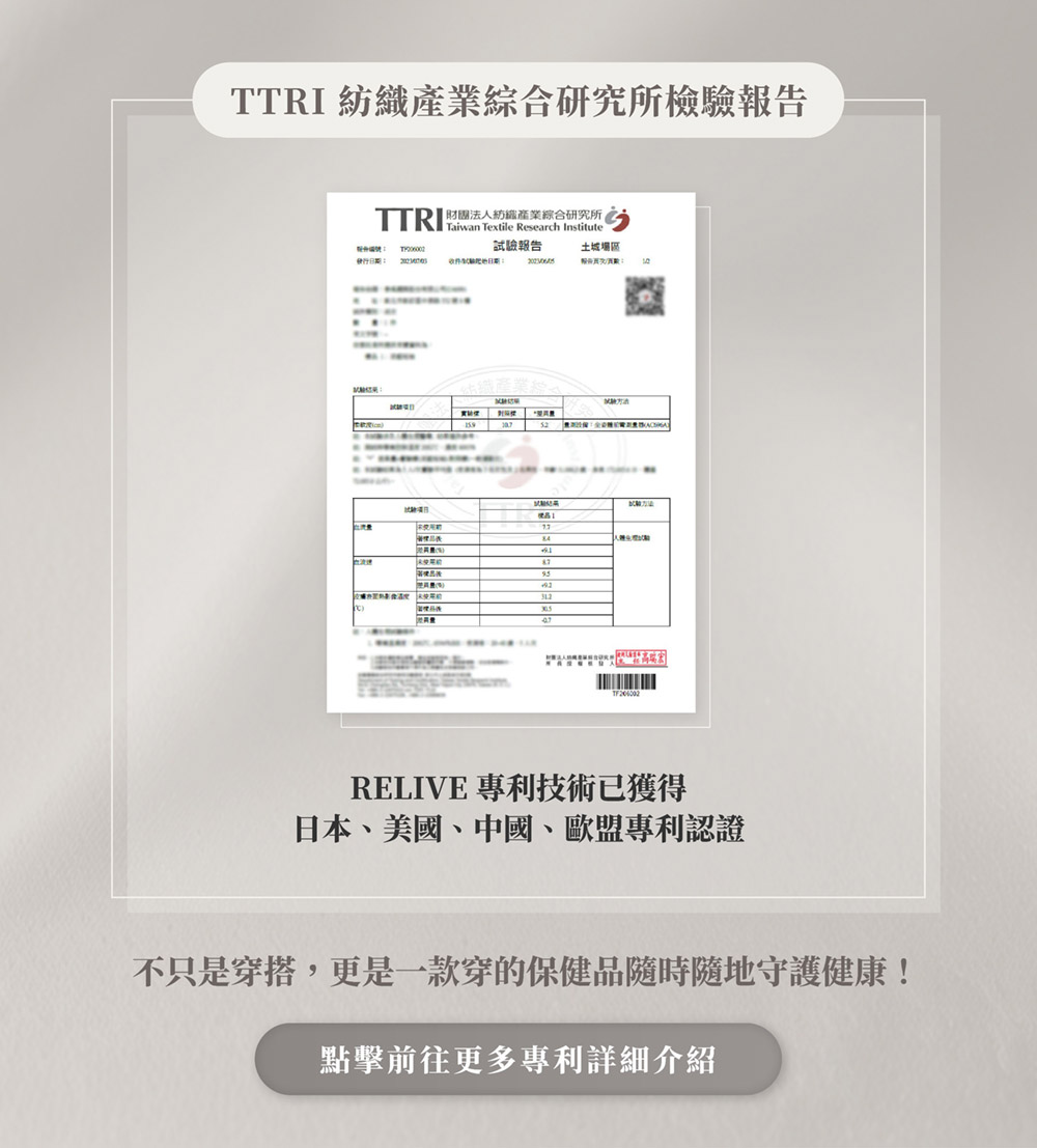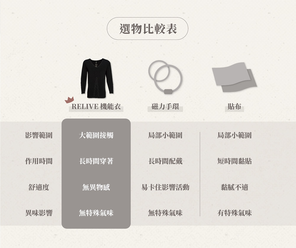 相較於局部作用的產品(如項圈、手環等),RELIVE 機能衣能大面積接觸身體,將健康效益全面覆蓋。