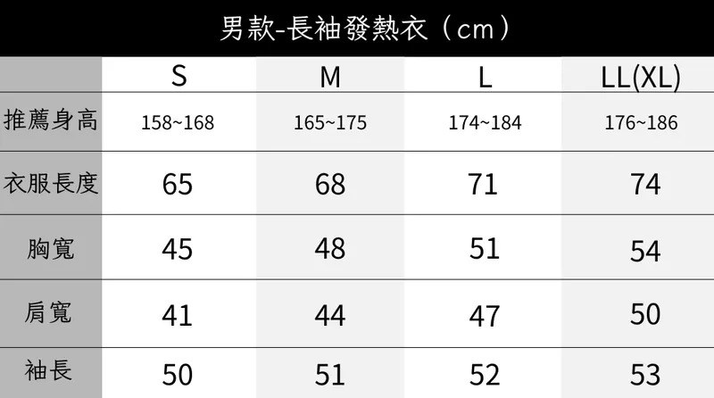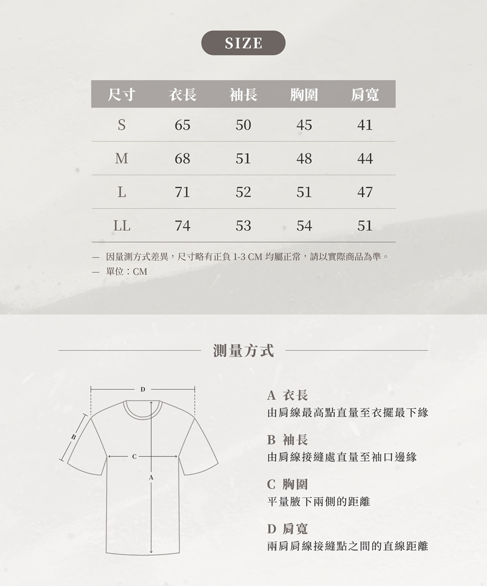 • L - 衣長71cm / 袖長52cm / 胸寬51cm / 肩寬47cm / 適合身高174~184cm