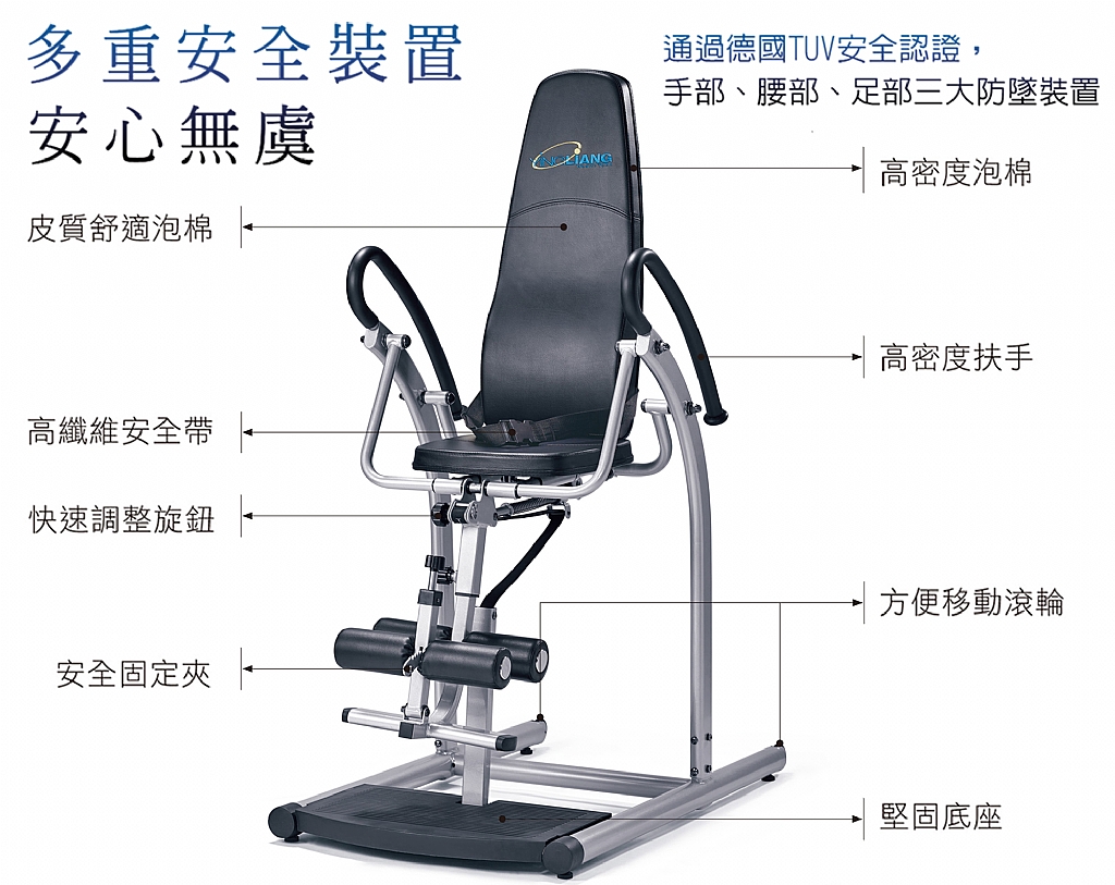 安全裝置設計周全、舒適,安心倒立 自行選擇適合的倒立角度