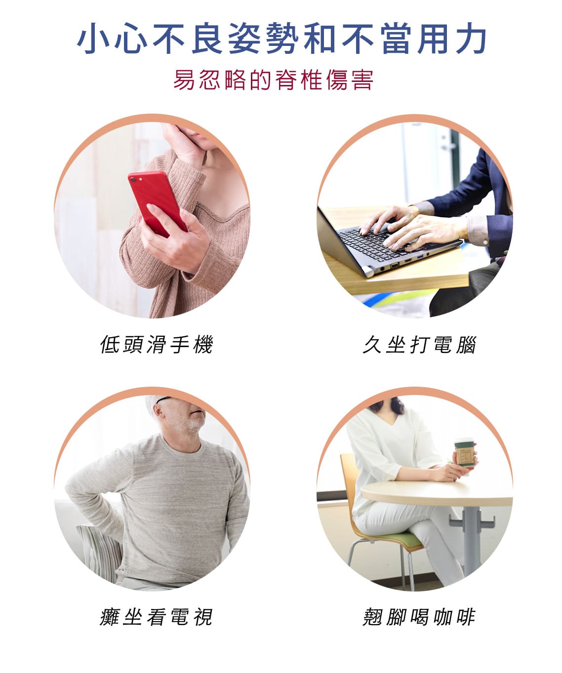 銀髮族核心肌群無力、或是許多人日常姿勢不良,例如翹二郎腿、長時間久坐、低頭滑手機等等,無形之中加重了脊椎的負擔,導致肩頸等各部位痠痛。