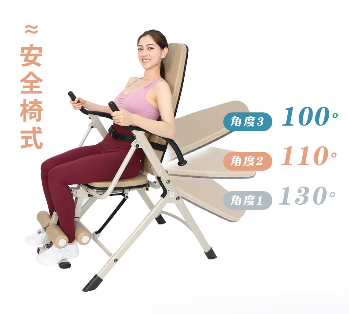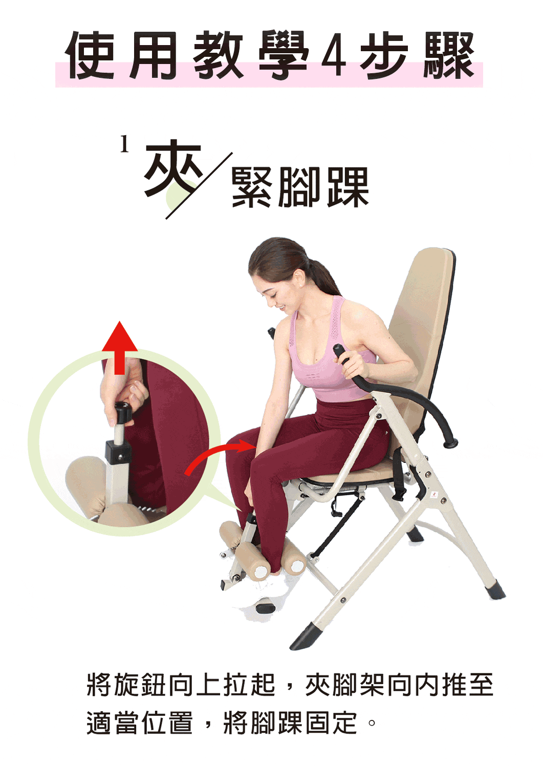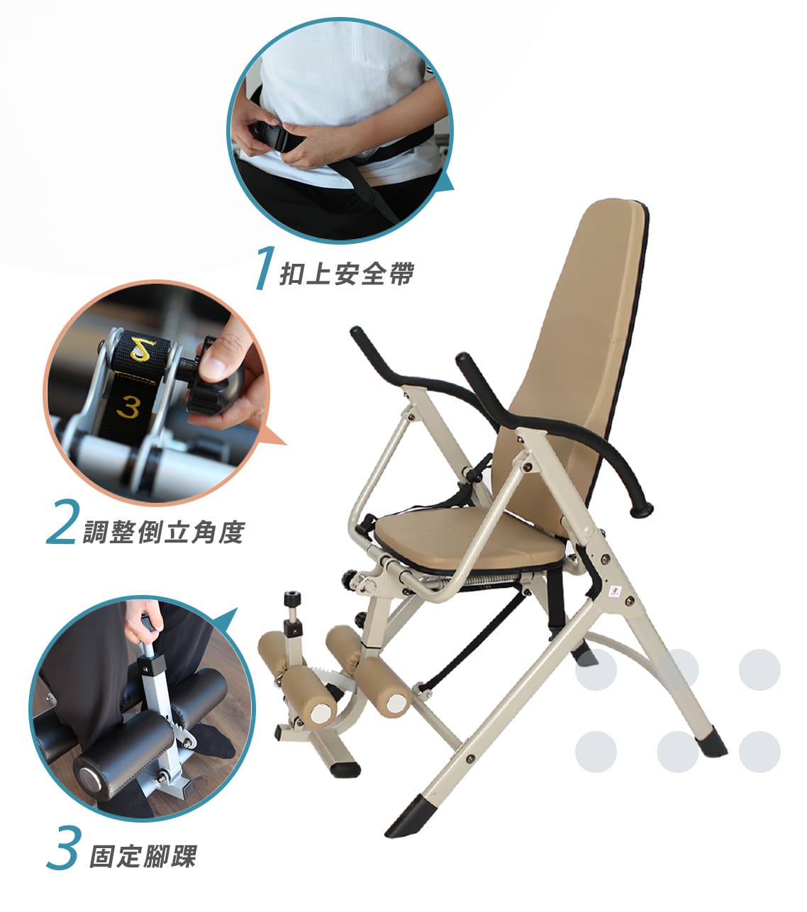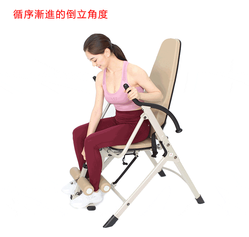 Q:如何使用盈亮「倒立椅」?  讓使用者能先坐著,躺著,再倒立。循序漸進的方式降低直接「倒立」的恐懼