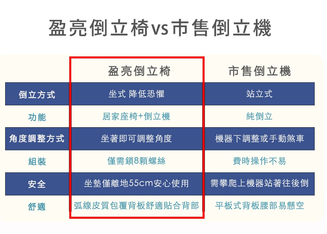我們做了「椅」式的設計改良。全台只有盈亮 有倒立椅的設計專利
