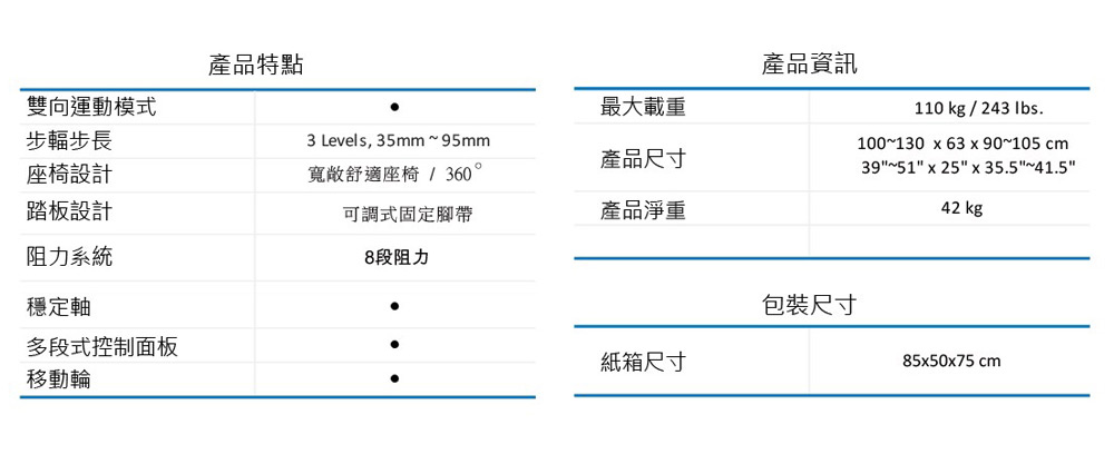 2. 步幅步長:3.5~9.5 cm (3 Levels)
